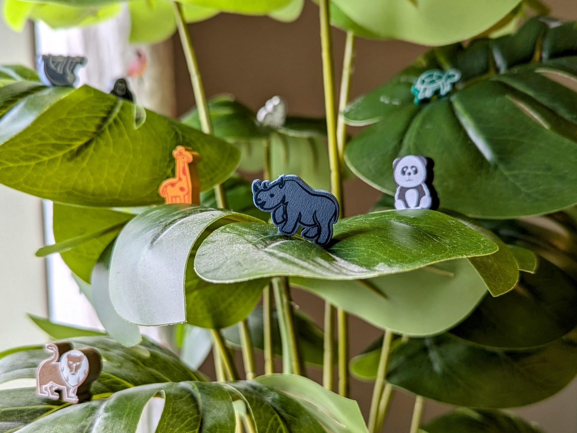 Of course we have to mention the cute ANIMAL MEEPLES! If we were being niggly, we’d prefer to see more colour variety – half of the meeples are different shades of blue/grey. There could have been non-realistic colours (e.g. a bright pink rhino), or some different animals that add others colours into it (e.g. birds and bugs). In fact, there’s no bugs in the game at all – more cute bugs please!