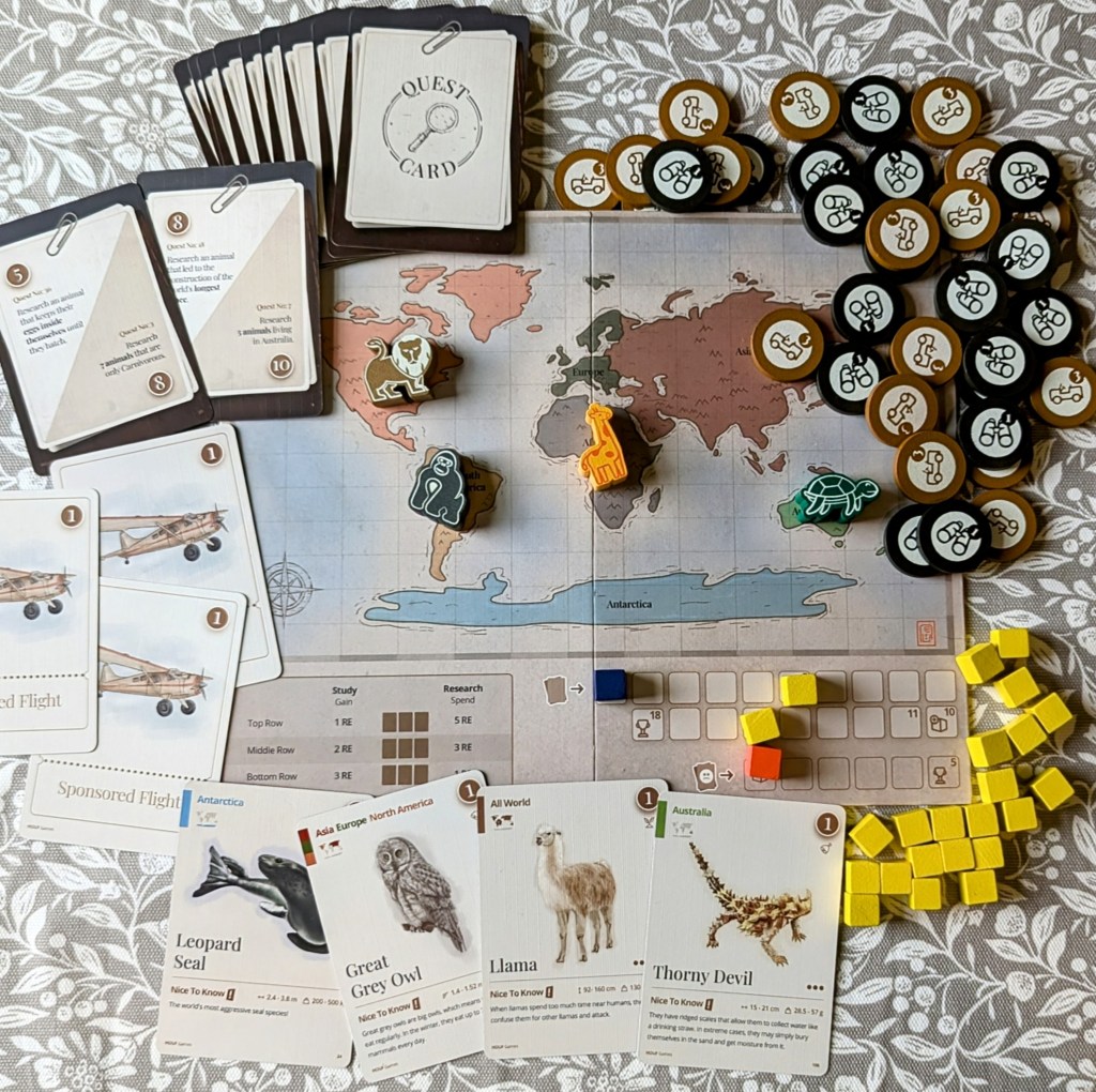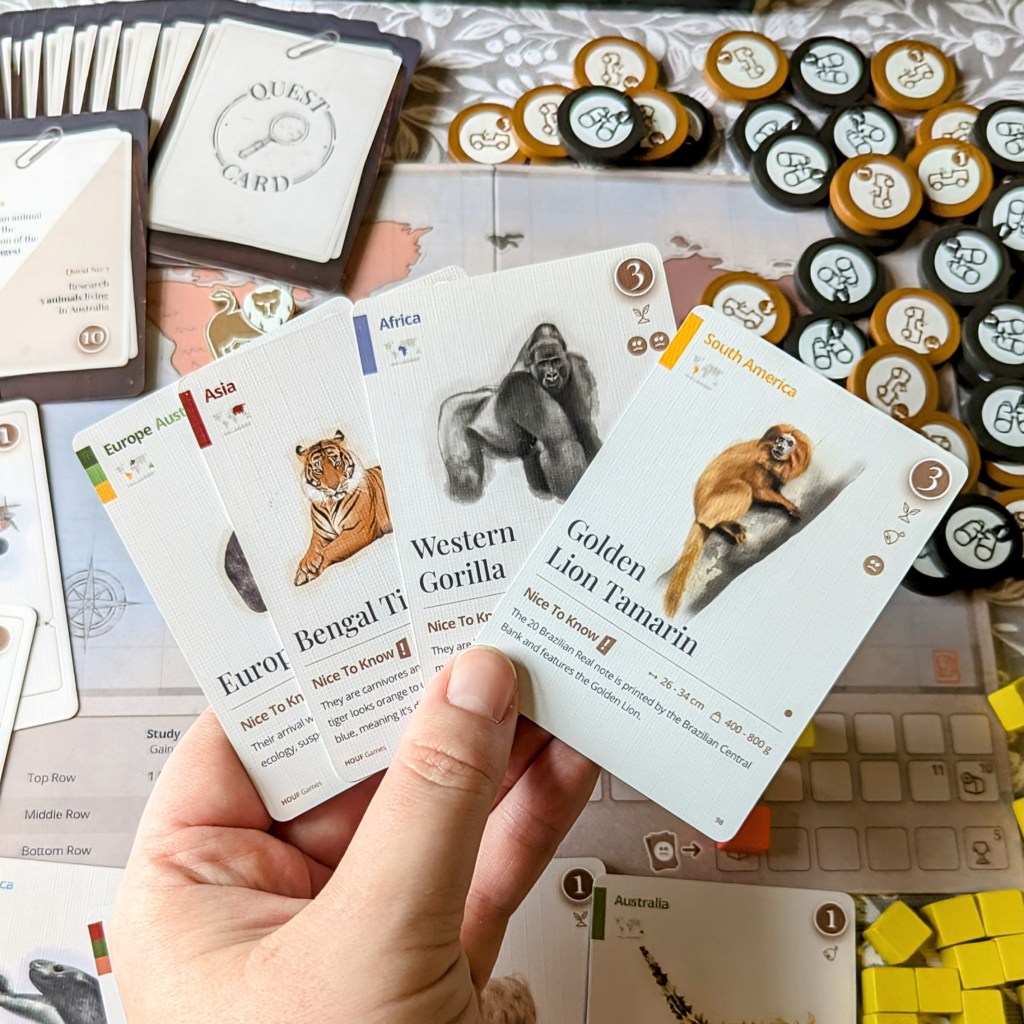 We like that each quest card has two potential quests to choose from, and you decide which quest to use at the end of the game. We also like that one of the two quests is for a specific animal, but given as a clue that relates to a card’s animal fact. This is great at encouraging you to read the facts on each card to try and find the animal the quest applies to. BUT it’s worth noting that the relevant fact is only on one animal card (even when there are multiple copies of that specific animal). We found that we didn’t get through the whole animal deck in a single game, which meant there was a reasonable chance that the one animal card with the relevant fact wouldn’t show up. This meant we were always using the quest ‘cheat sheet’ to check which animal we needed, which I don’t think is the intention (or it shouldn’t be, in my opinion). It also meant that achieving that quest option was often unlikely.