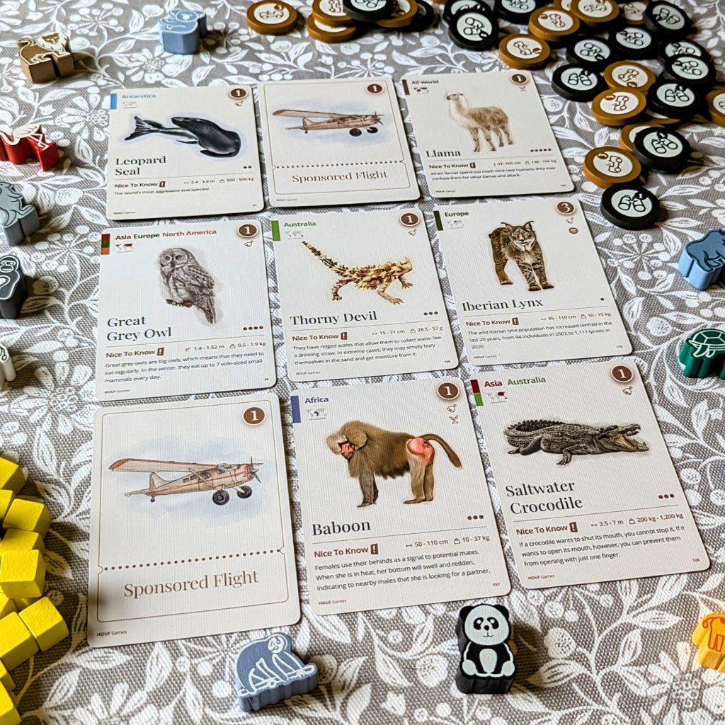 Players can also only research (collect) the animals that match the continent where their meeple is currently located; that is, unless they can pay the exorbitant cost (9 RE) to fly continents, or are lucky enough to catch a sponsored flight card when they come up in the grid (which has to be on the same row as the animal they want to research).