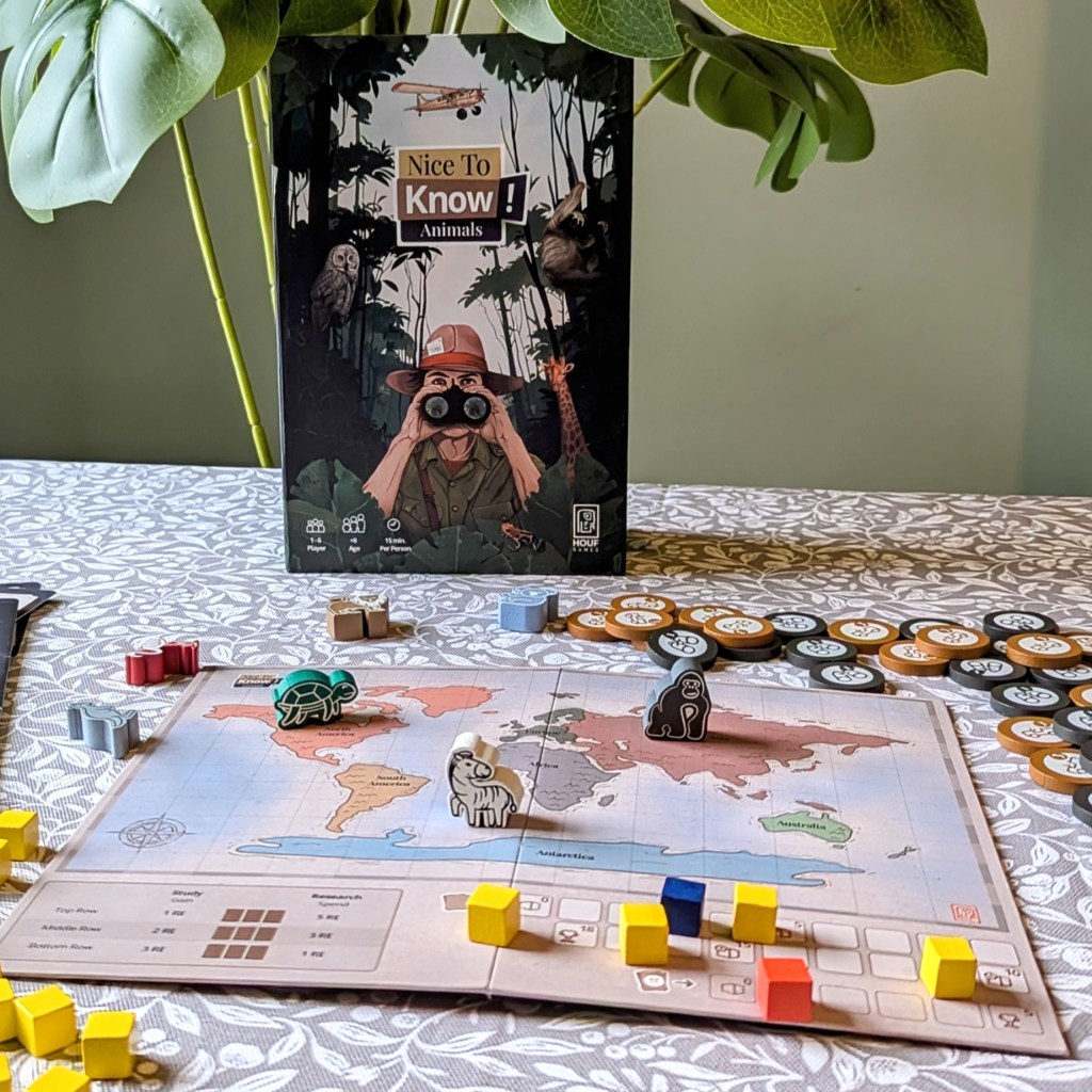 In Nice to Know! Animals, players are zoologists investigating animals around the world. On a turn, a player can choose to either study or research animals from the central grid: