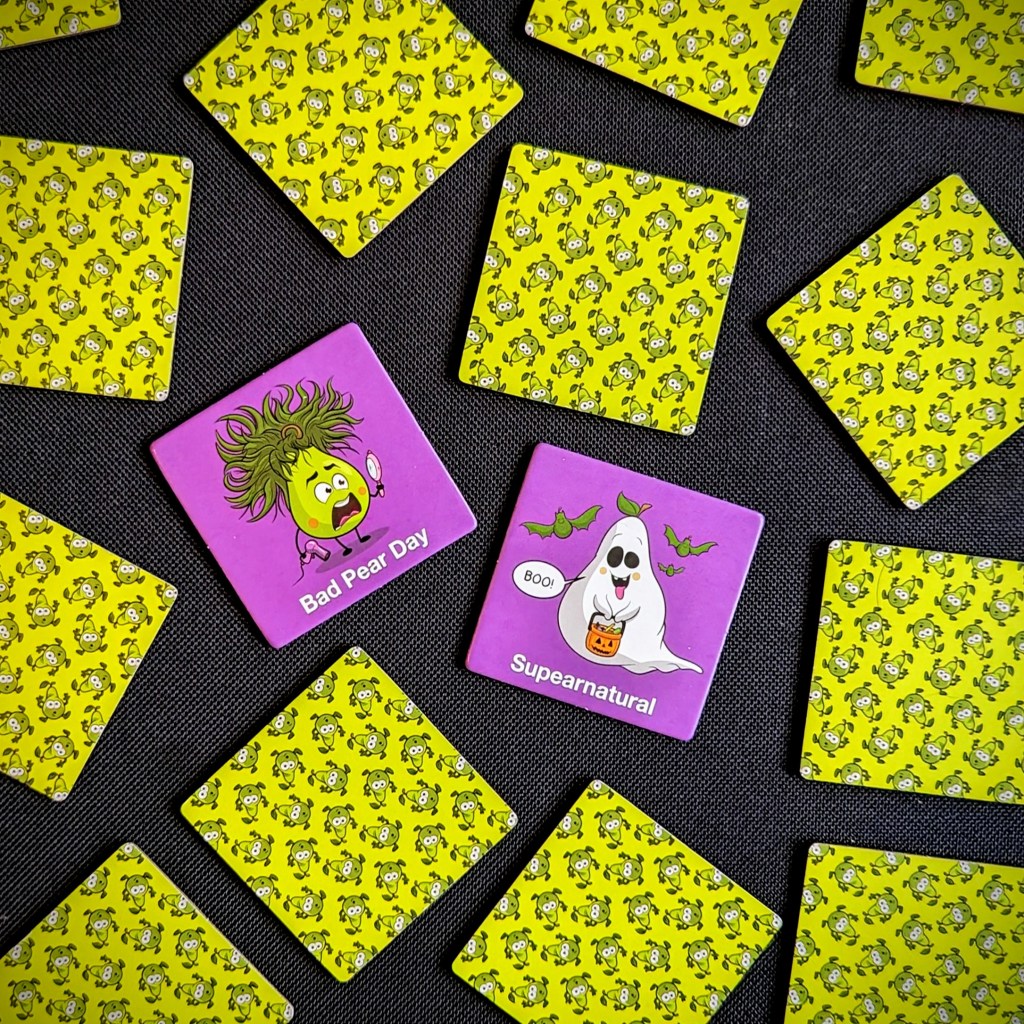 - The rules are simple and the game is quick to set up and teach. With the matching background rule, we thought there could be a potential for people to continuously pick the same tiles to stack up tokens (as there’s no rule to say you can’t keep picking the same tiles). In reality, we doubt that would happen, as other players would clock on quick and be ready to grab the pear before you do.