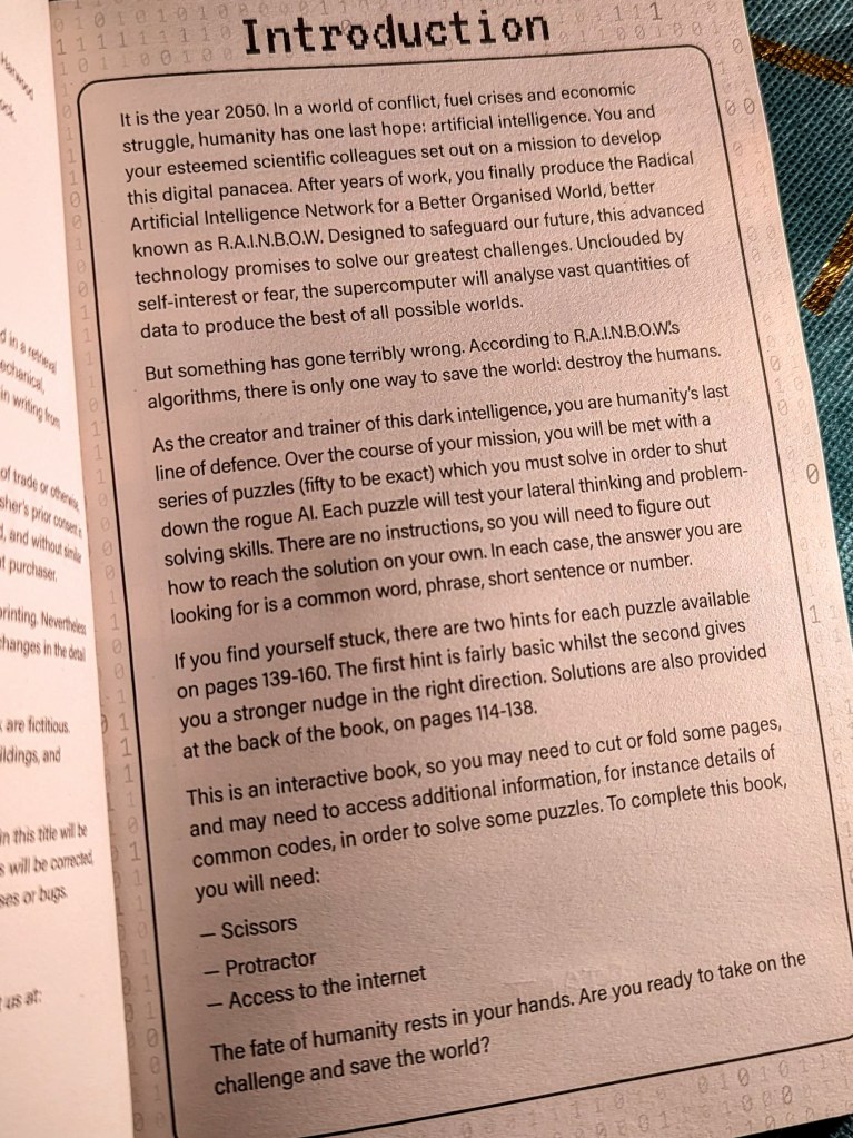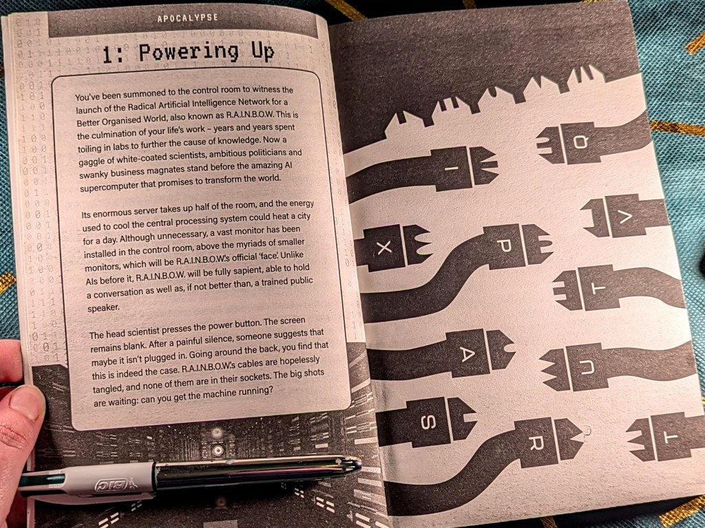 In Apocalypse, work your way through a series of puzzles to save humans from the awry AI. Each turn of the page progresses the story and has a new puzzle to solve.