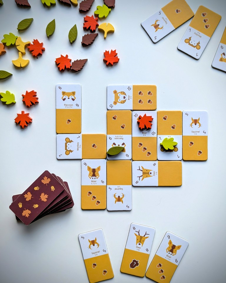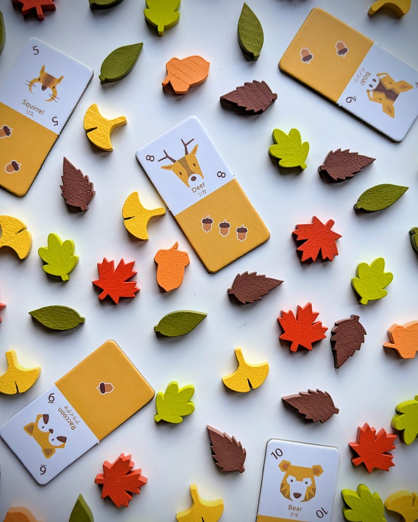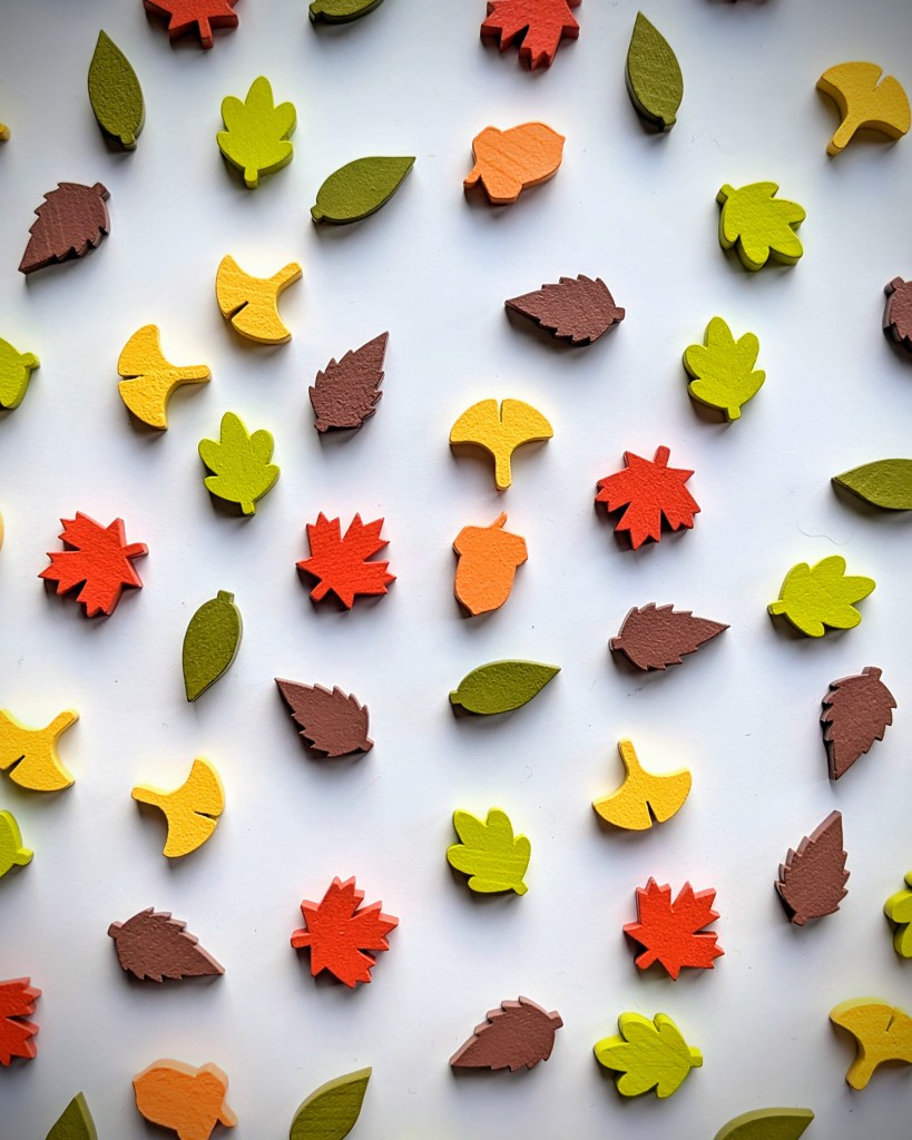 - The player tokens are different leaves and we thought these were really cute (I especially liked the yellow ones – I think they might be gingko leaves?). We didn’t really understand why you were supposed to use two sets of leaf tokens each in a 2-player game – we were always fine just using 1 type and didn’t run out.