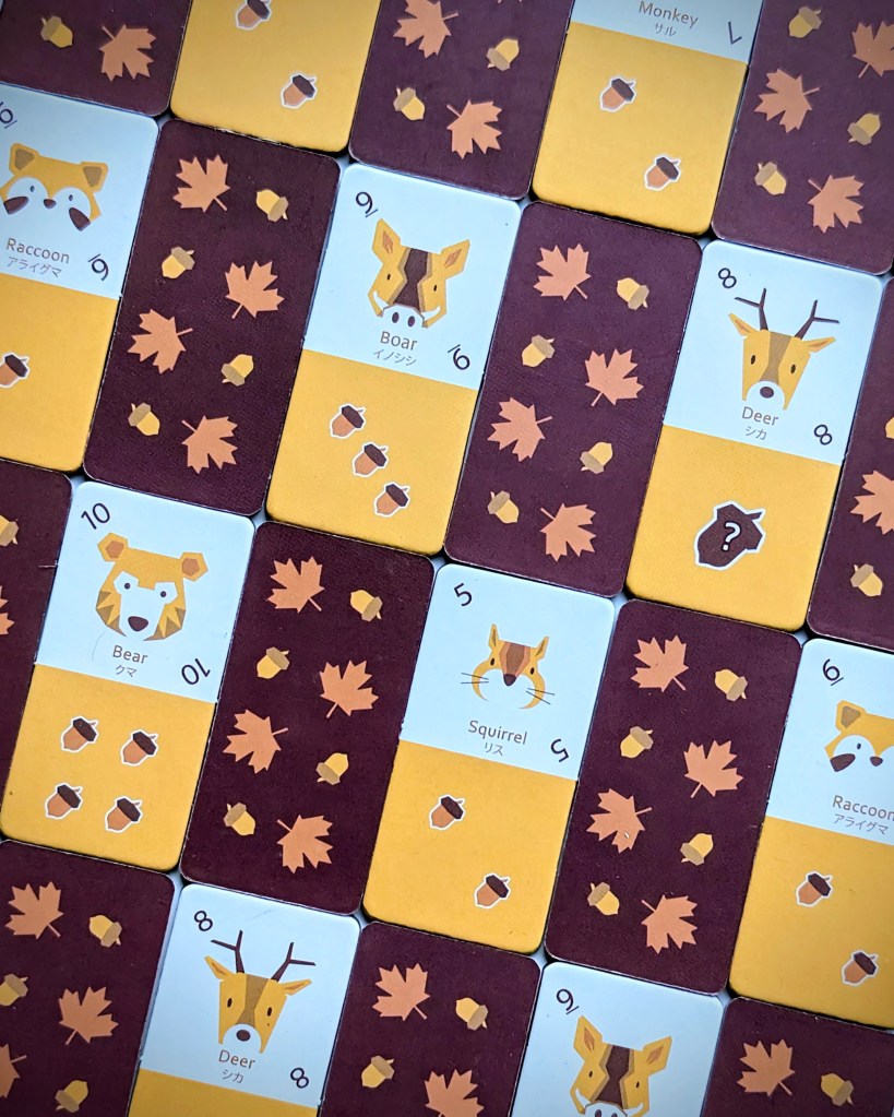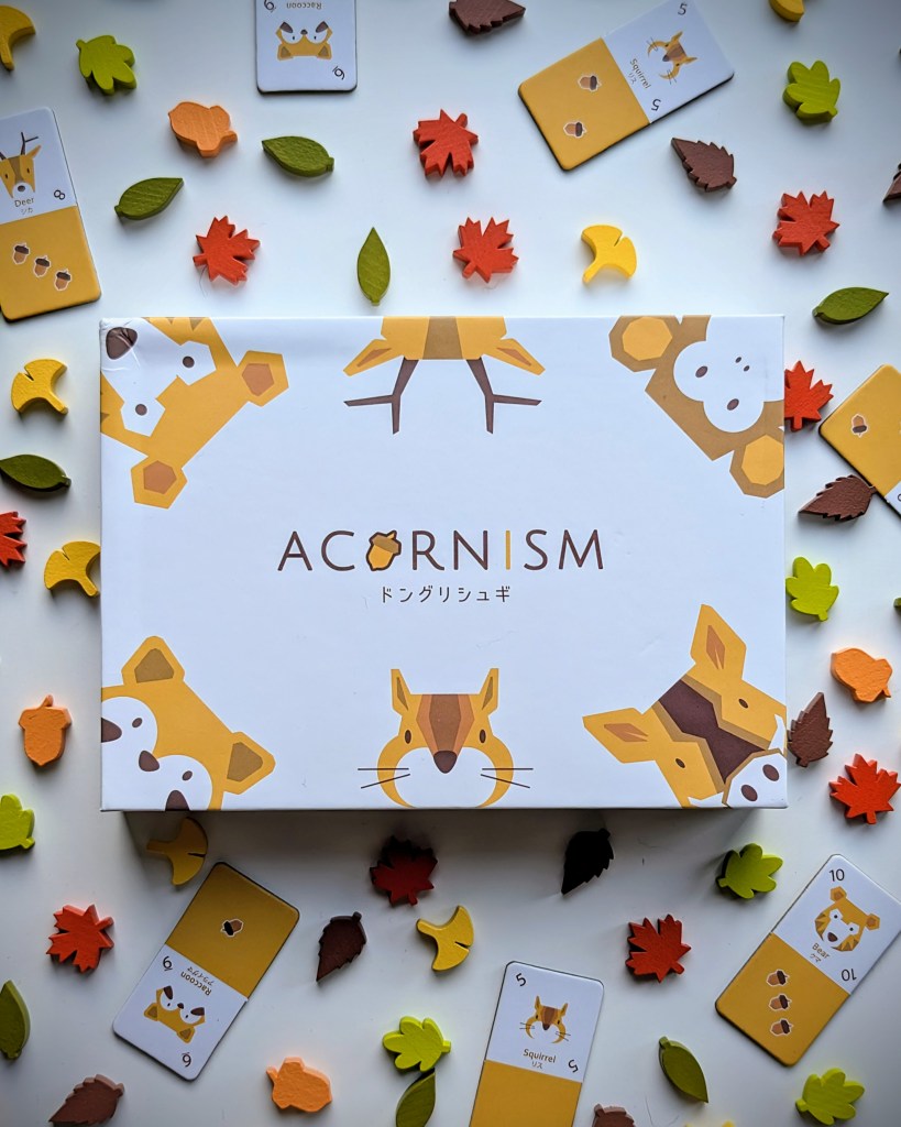 In Acornism, players take it in turn to play small domino-style tiles in a grid: one side has a cute but hungry forest critter, and the other has up to 5 acorns. You can only place acorns adjacent to critters, and vice versa. If a critter gets surrounded on all 4 sides with the EXACT total number of acorns they ask for, the player who covers the 4th (final) side gets to claim that animal and score those delicious points.