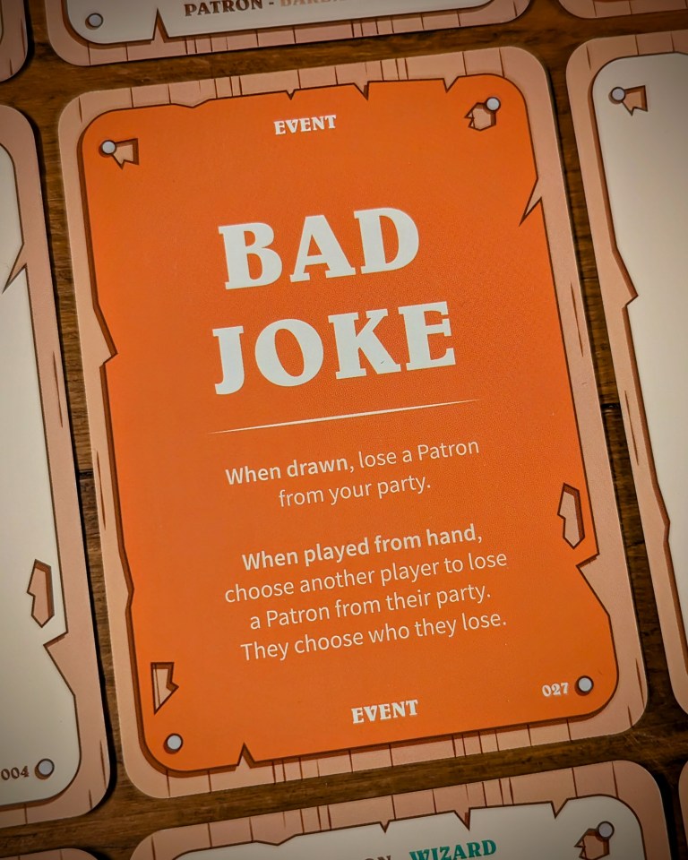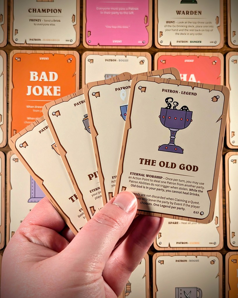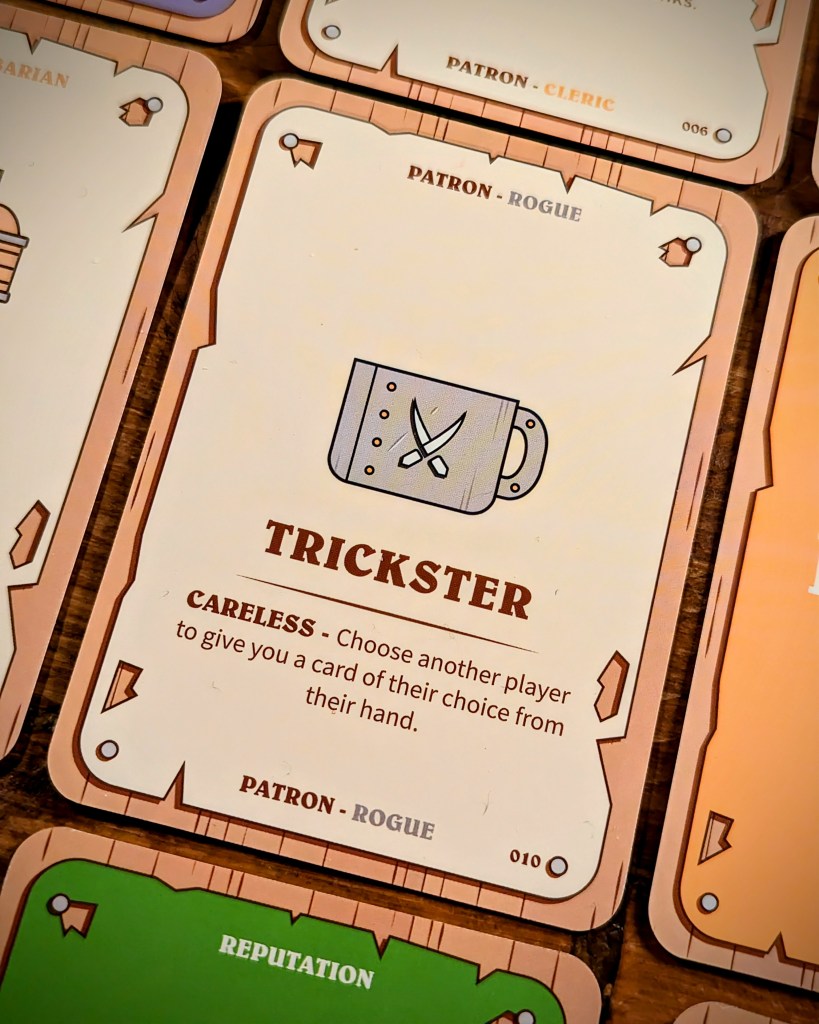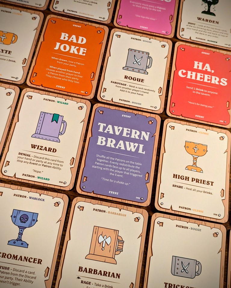 - Play a Patron or Event card from your hand (1 point). Patron cards belong to different adventurer classes (ranger, barbarian, etc) and have different abilities when played, such as giving opponents drinks or ‘healing’ your own drinks.