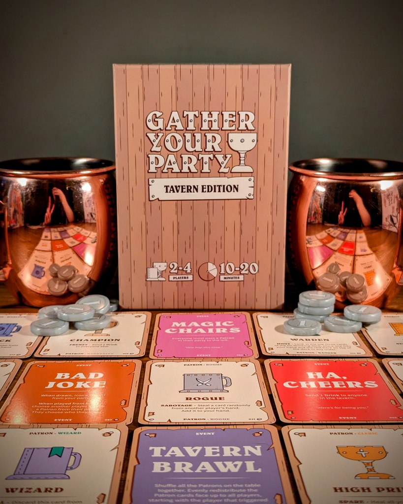 - Gather Your Party brings the classic fantasy adventurer & tavern concepts together in a new and interesting way. We like the simple but fitting designs of the different Patron cards with their various goblets and tankards – especially the superpowered Legendary Patrons!