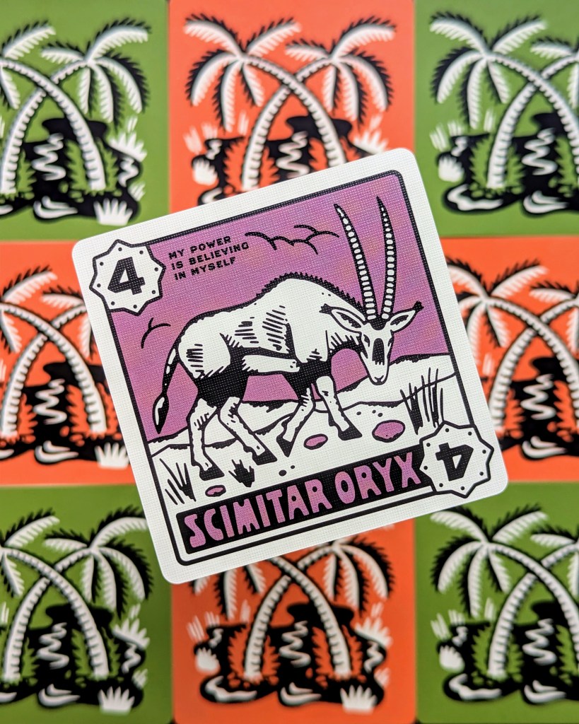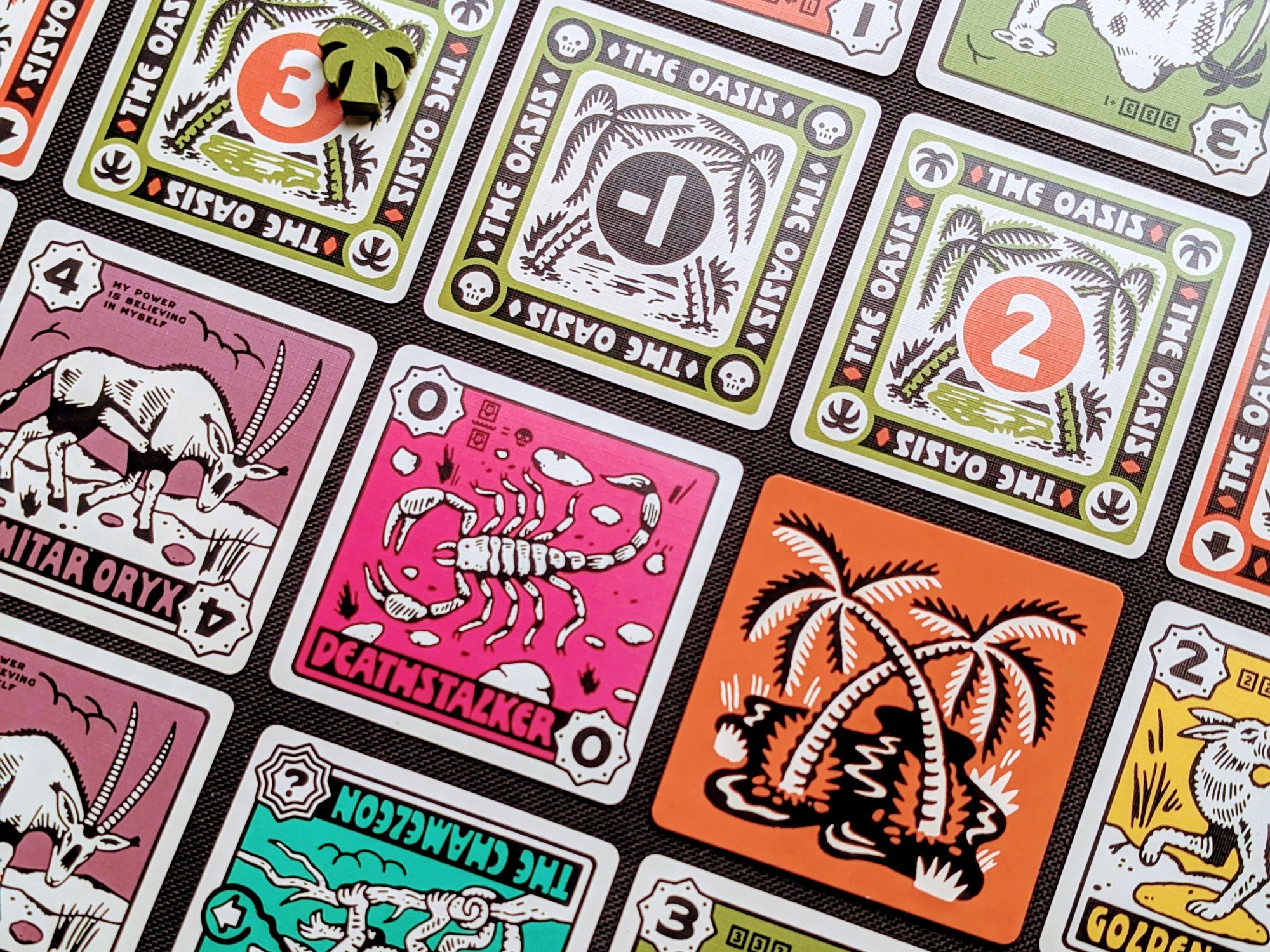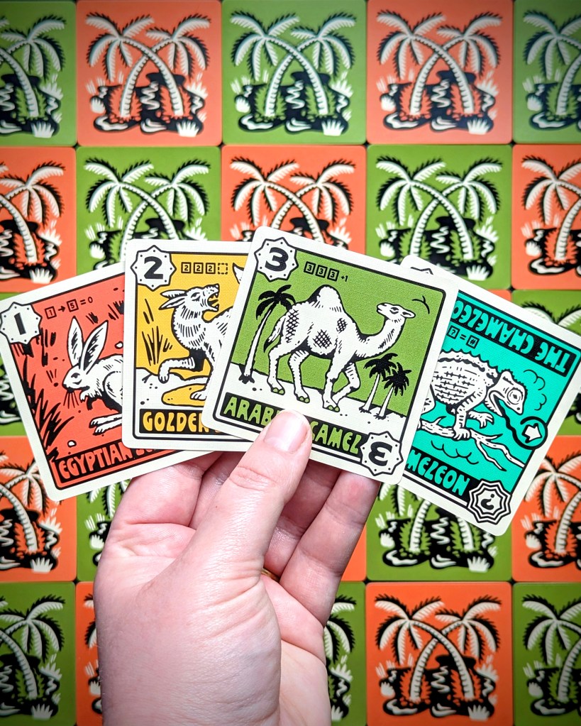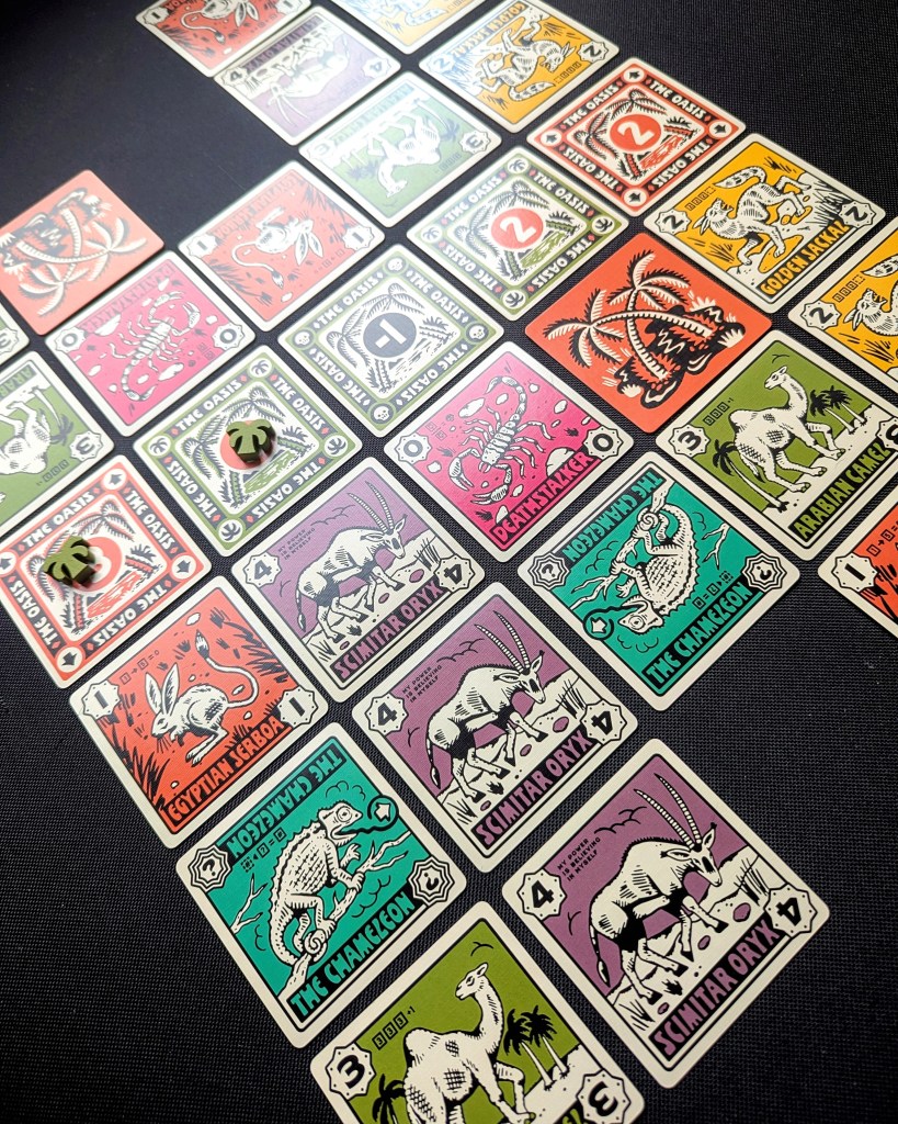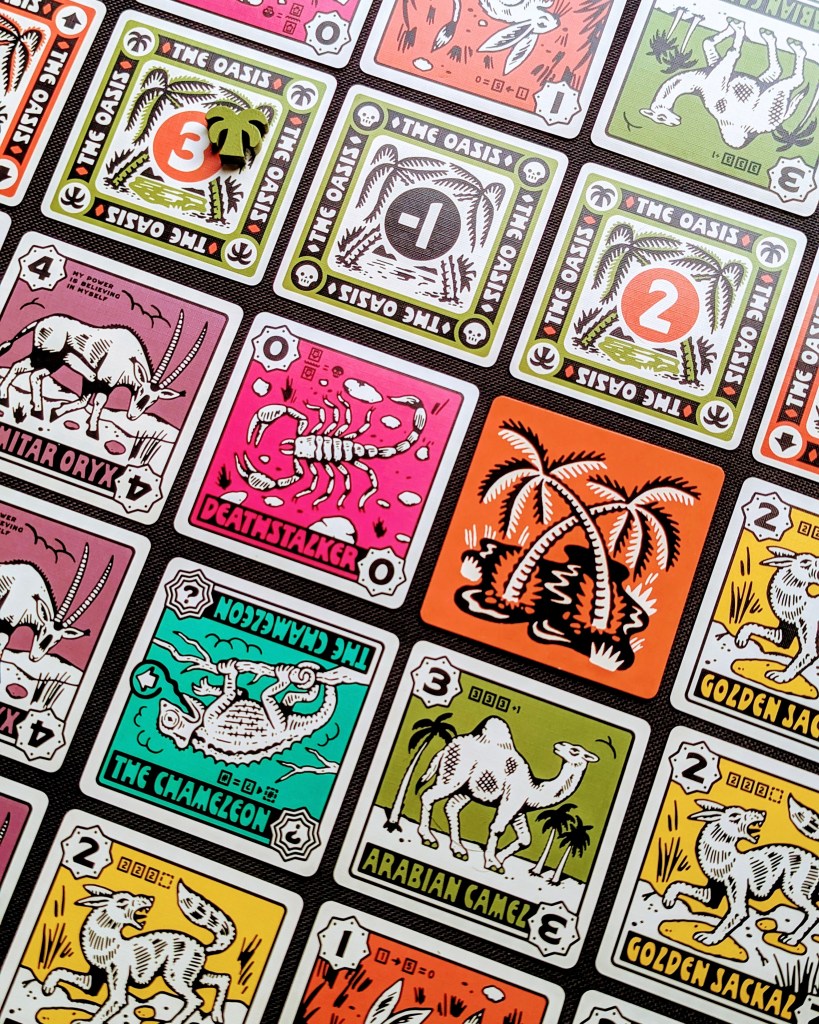 The striking vintage vibes of the Desperate Oasis artwork instantly hooked us in – it just exudes cool! As the round progresses, the cards build up a bold and colourful Saharan landscape. The oasis cards have slightly different designs depending on the type (positive, negative, portals) and some of the animals included on the cards were completely new to me, which I loved. Of course my fave was the self-confident scimitar oryx!
