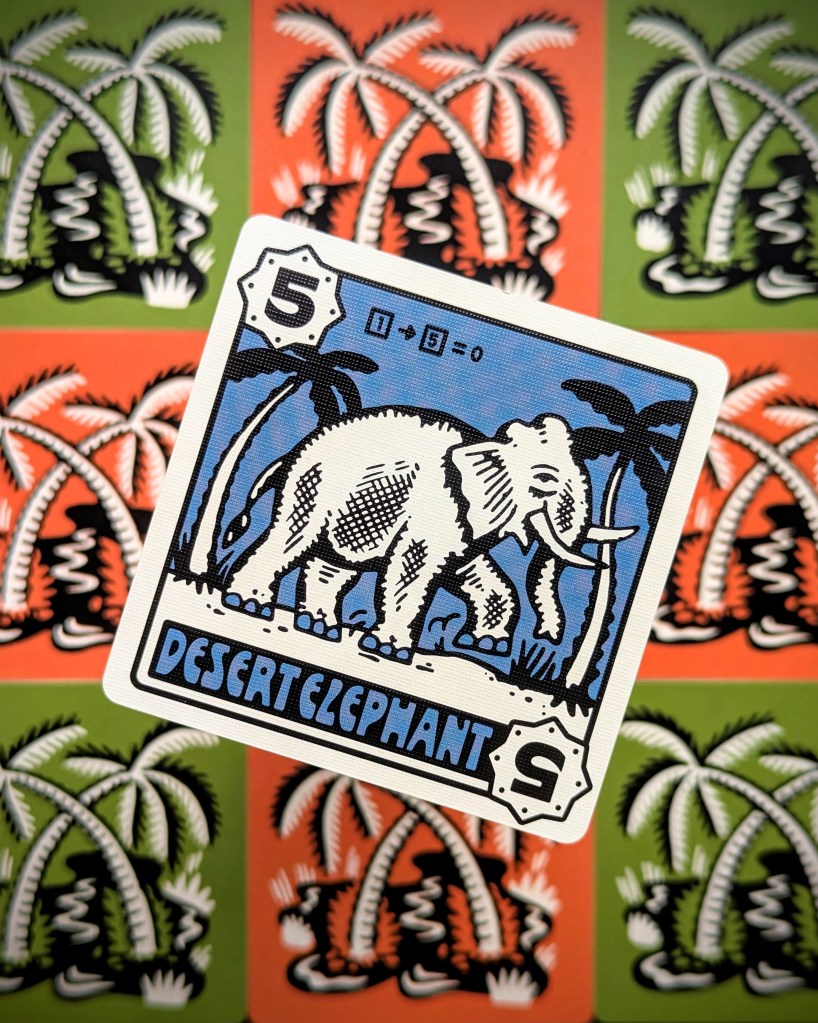 We love a lane battler, and there’s more to Desperate Oasis than ones we’ve played before. Combining animal powers with the ability to place cards on your side OR your opponents, and to even place cards secretly, adds an extra layer of tactics. (Is my facedown card an elephant, or just a distraction?) The spatial migration of animals from adjacent columns – or from your opponent’s side through portals – feels novel and adds an extra layer of thinkiness to you placements. And fighting to LOSE the least appealing Oases adds a layer of tension. It keeps you interested in what the other player is up to, and what you can do to stop them. So many layers and in such a small box!