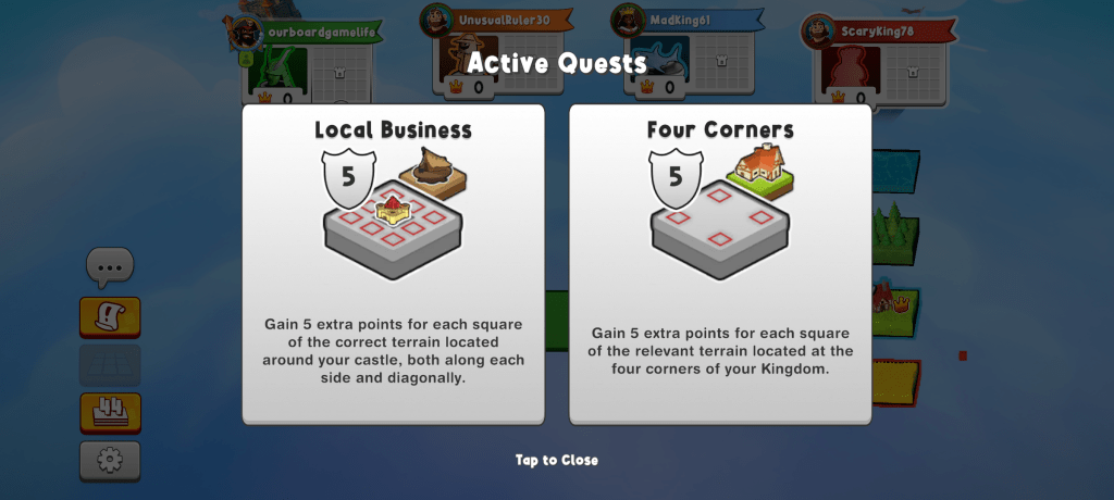 The app includes additional ‘quests’, which I believe were originally introduced in the physical expansion Age of Giants. These quests include placing particular terrains next to your castle or in the corners of your kingdom, having terrains without crowns. Adding these quests really elevates Kingdomino: Digital Edition, giving different ways to seize victory. I’ve won some games by focusing on the quests, and others by ignoring the quests and focusing on the traditional scoring of terrains alone. Including the Harmony and Middle Kingdom quest tiles from the original board game, along with new quests unique to the app, is a nice touch.