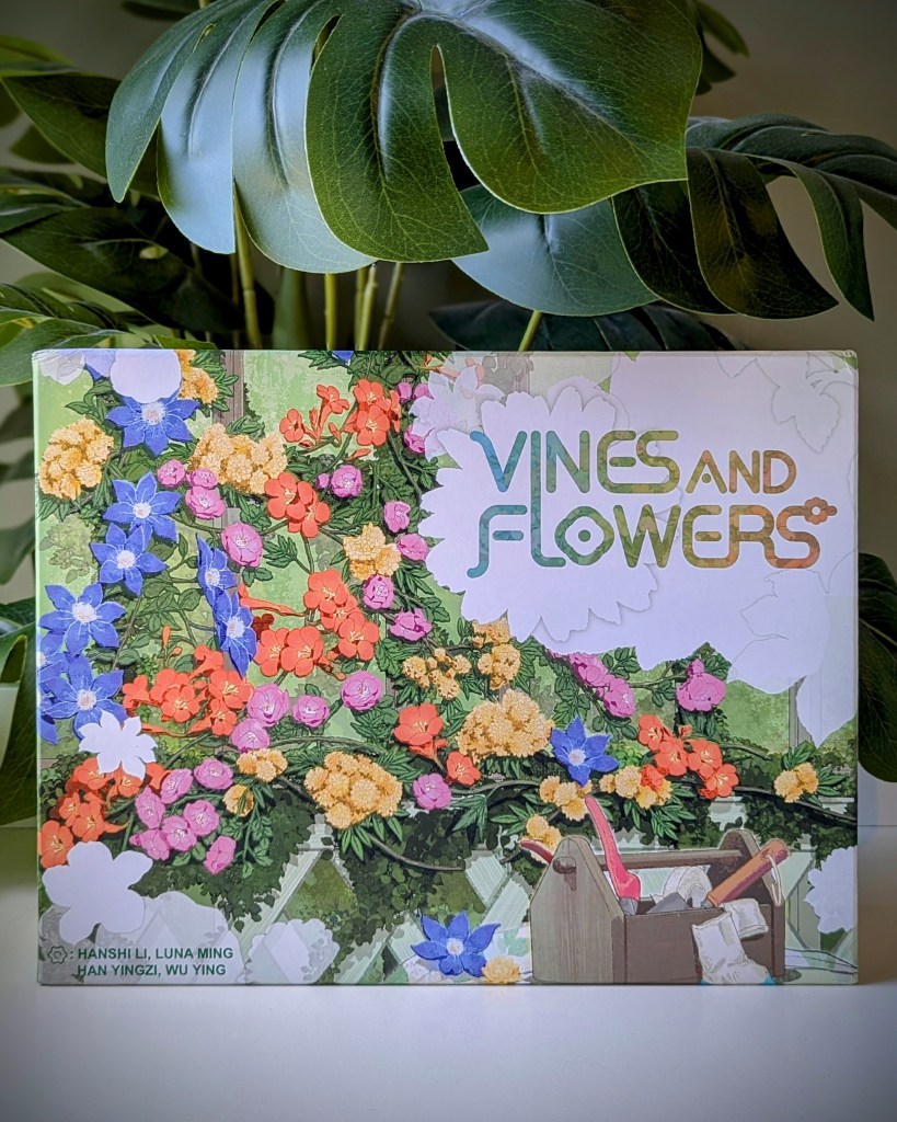 - Vines and Flowers is a relaxing tactile game with a pretty, almost vintage-like aesthetic, and the vertical tile building feels unique. Matt in particular enjoyed spatially puzzling out how to gain the most petals in one go – although as the pergola builds up and out it gets harder to see the vines/flowers that are deeper in the centre of the structure. It did sometimes feel like the main ‘strategy’ was to collect tiles until you can take two placement actions to start and complete a flower in one turn – otherwise you risk opening up a chain that your opponent takes advantage of.