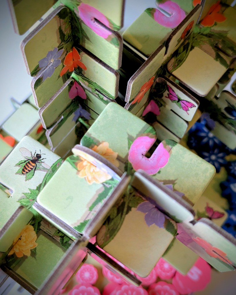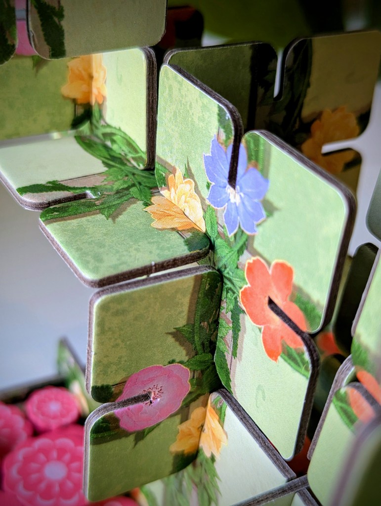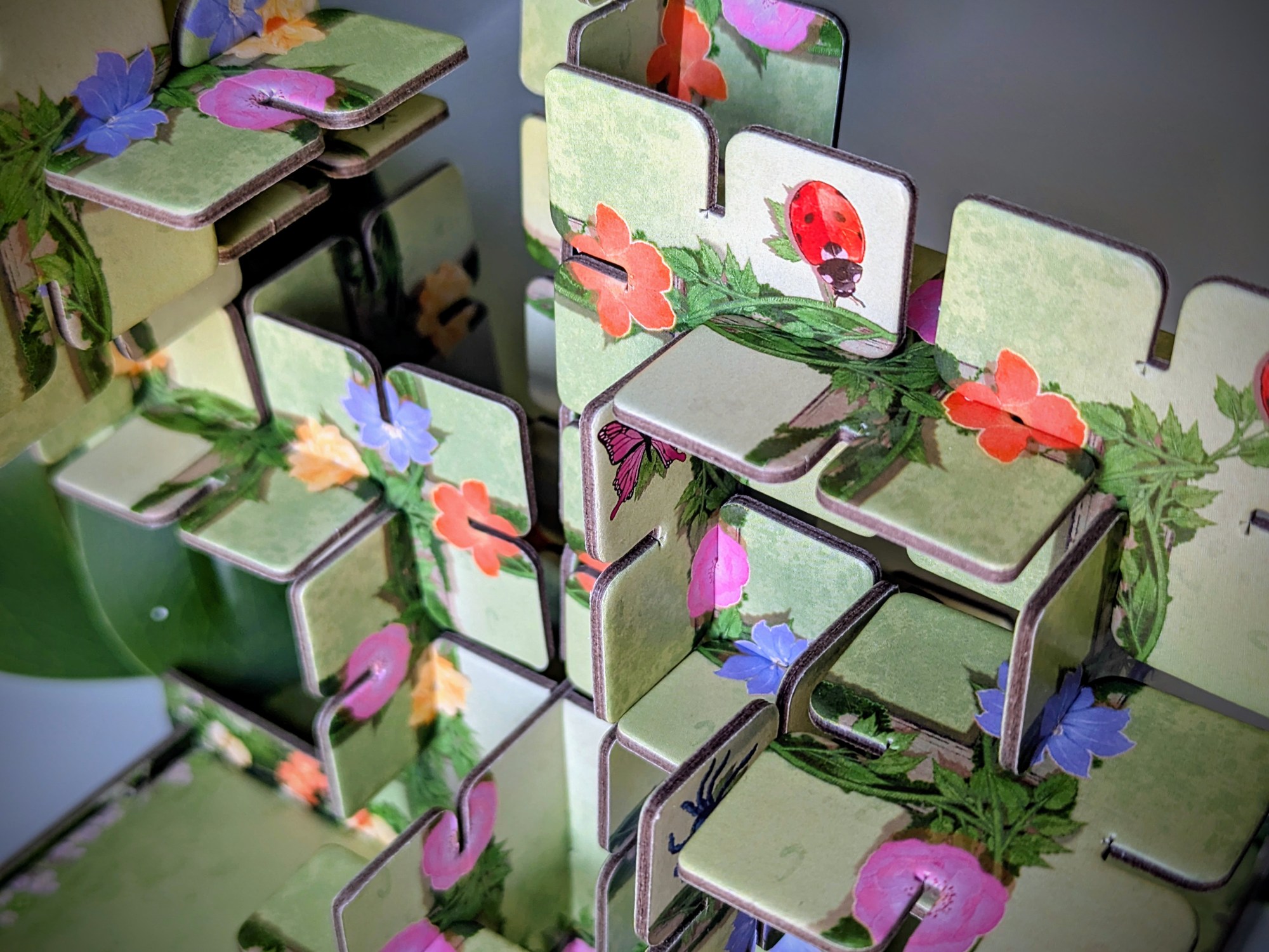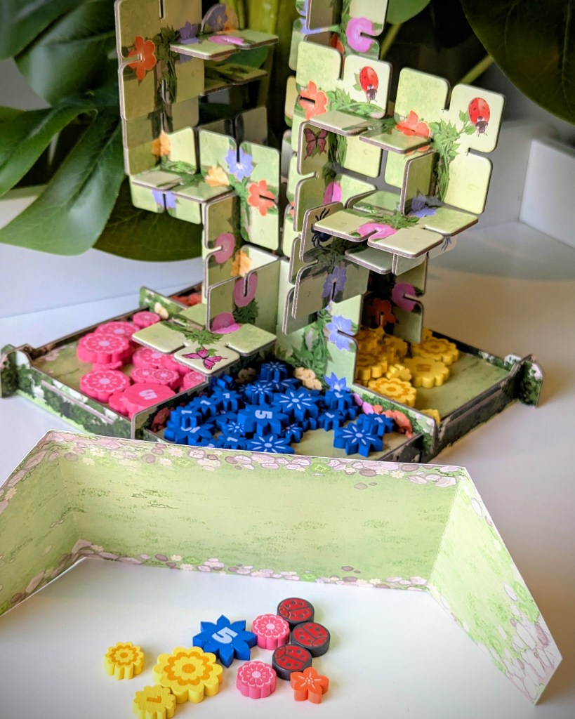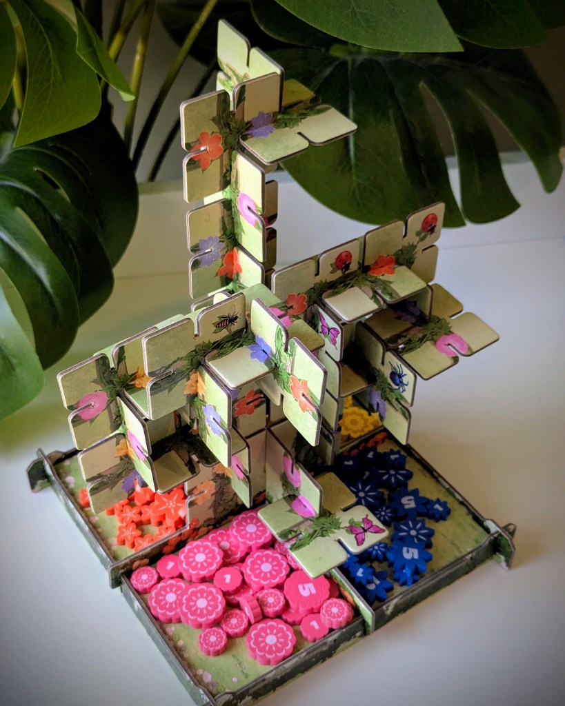 Each turn players have 2 actions to spend on collecting flower tiles from a market row, and/or using tiles from their hand to build up a pretty 3-dimensional pergola. If the newly placed tile completes a flower that player gets a petal token in that flower colour, plus an additional token for each connecting flower of the same colour along the vines. Tokens are kept hidden behind each players’ screens, and at the end of the game, players count up their rarest petals (i.e. the colour they have the least of). The player with the highest score wins.