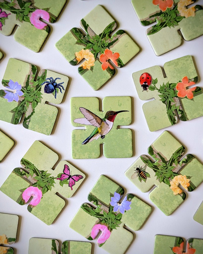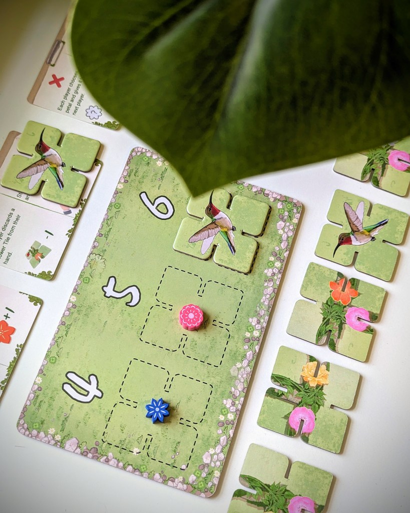 The game starts with 2 hummingbirds in play, but there are 3 others that players can add into the game by completing ‘contracts’. Players must reveal 4/5/6 identical petals from behind their screen to complete a contract, allowing them to claim 2 ladybird tokens and add a hummingbird to the tile bag. When a 5th hummingbird is drawn into the market, the game ends immediately.