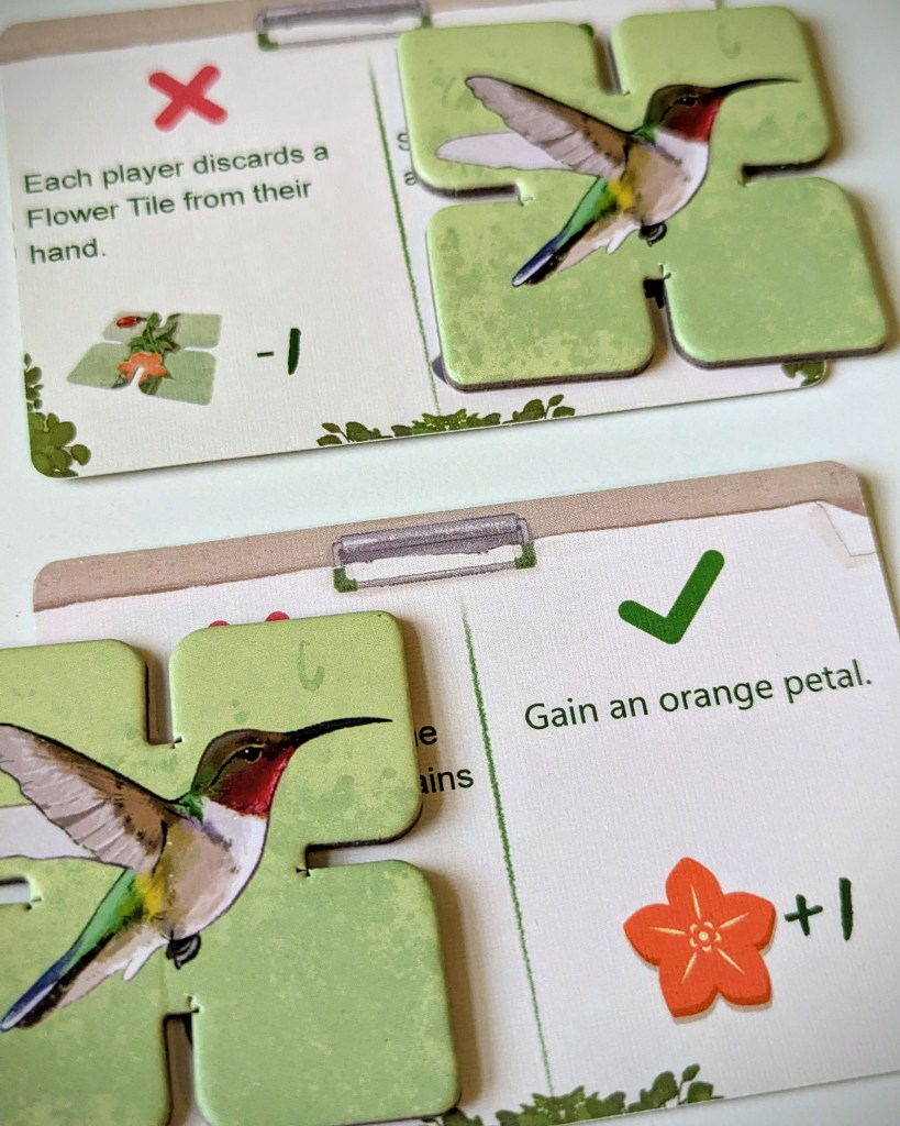 - 3 event cards are randomly selected each game, and activated in order – so if you claim a hummingbird tile, you don’t get to pick which personal effect to activate. Personally I think this made things more interesting (when best to time grabbing a hummingbird, or leaving it to eventually activate the global effect), but I could see others finding this annoying.