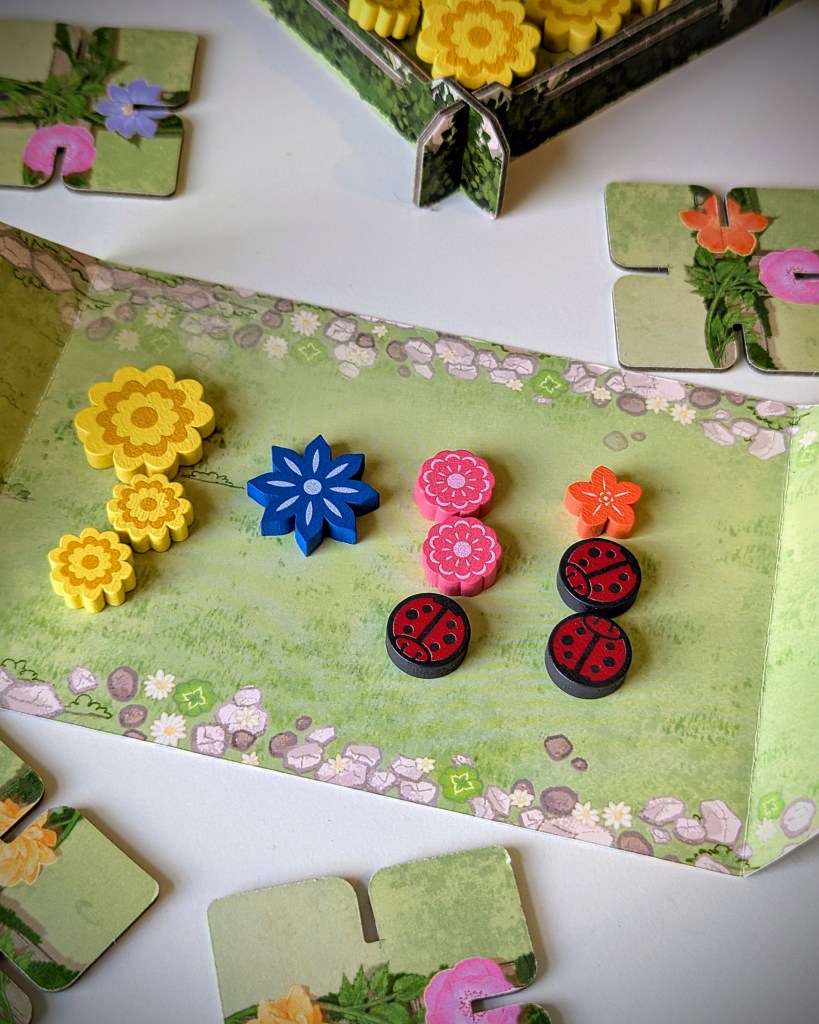 - I think keeping your petals hidden behind player screens is interesting, but there are some elements that I think conflict with this intention. For example, there are 5-value petal tokens, but if you decided to swap single petals for a 5-token during the game, surely you give away that you have (at least) 5 of that type? Also, at the end of the game, according to the rules the players remove their screens and then simultaneously assign ladybirds to specific petal types; doing this as open information can result in a bit of gaming or lead to stand-offs. In my opinion it makes more sense to assign ladybirds BEFORE removing screens.