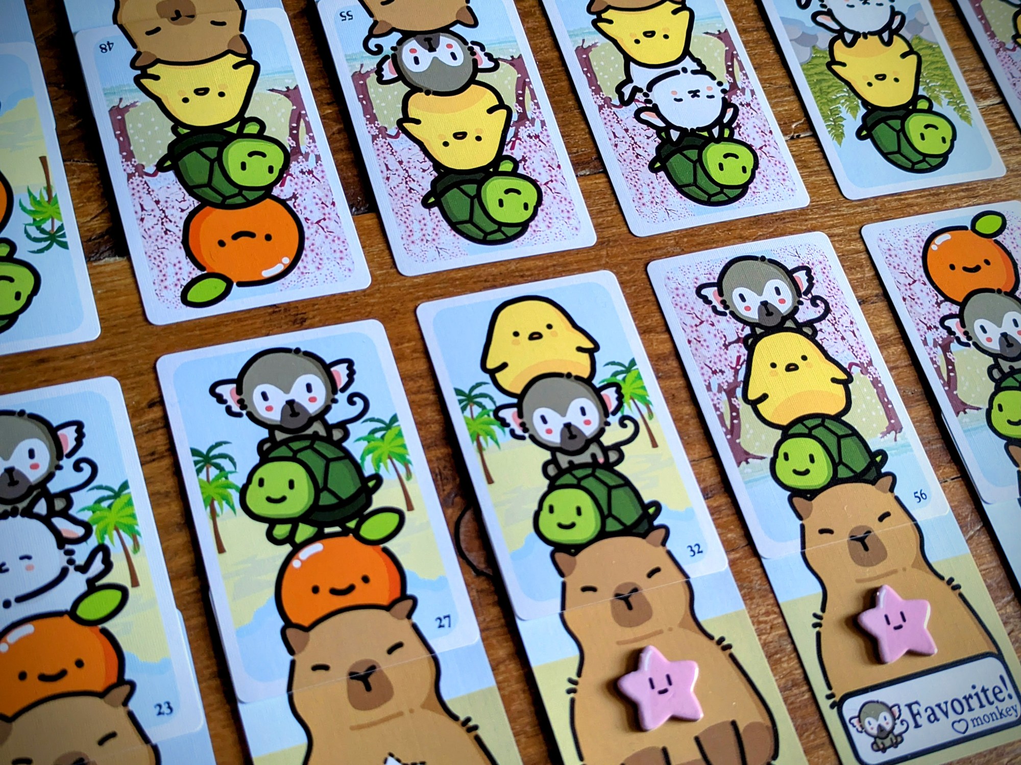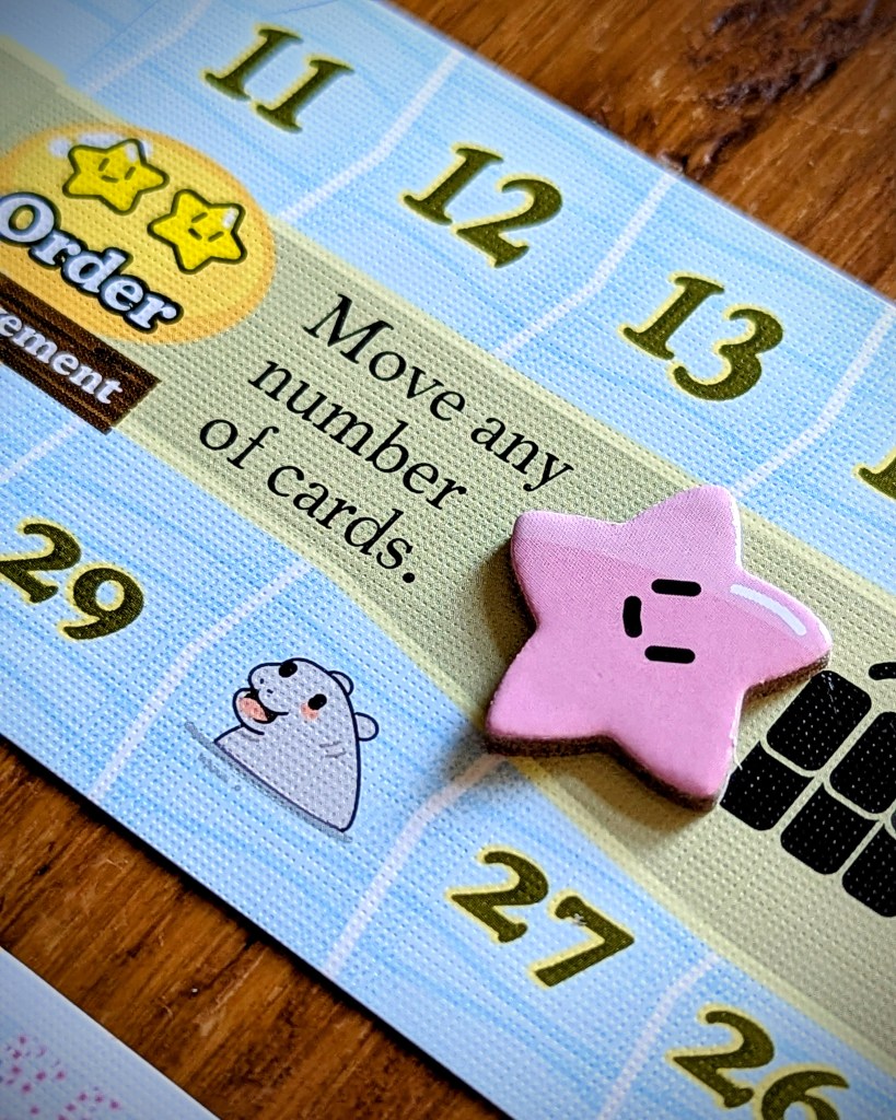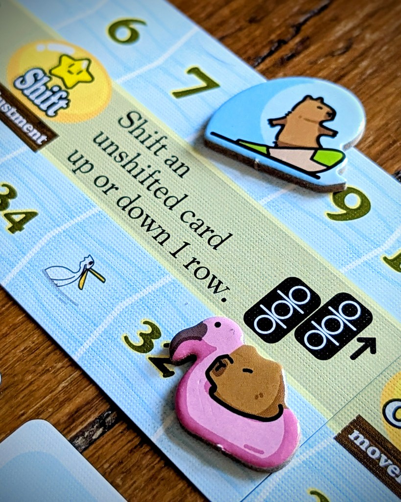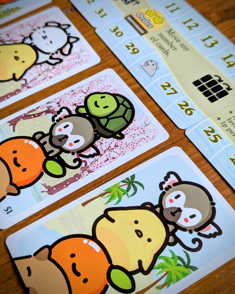 The production is well thought out and makes it easy to keep all in one small box, e.g. the double sided nature of the cards. The tokens are nice and thick, and the cardboard you’d normally throw out once the tokens are popped is instead used to keep the tokens safe. My only niggles are that the surfboard capy player token is a little too large for the score track. And I would prefer more colour variety for the star tokens to better tell player colours apart – at the moment there’s pink, white, light brown and dark brown (why not blue for the surfboard?). An additional subtle signifier might also be helpful for colourblind players.