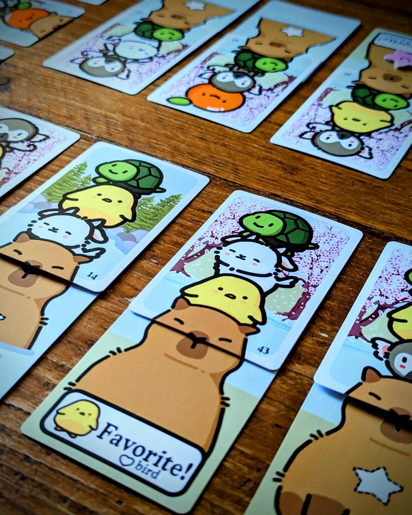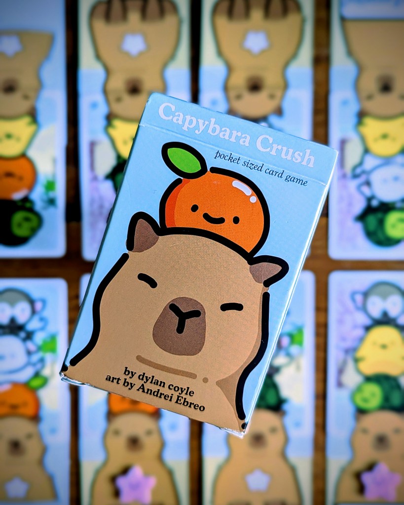 Capybara Crush is an enjoyable puzzly game that covers the 3 all-important Cs: Cute, Cozy, Capys! There’s enough bite to the puzzliness to make it feel satisfying, without taking away from the easygoing capy vibes (despite the game involving critters fighting for life in a raging river…so cozy, haha). Our friends loved this one so I think it’s going to be a go to gamenight filler going forward. Dylan, the designer, crushed it! (see what I did there?!)