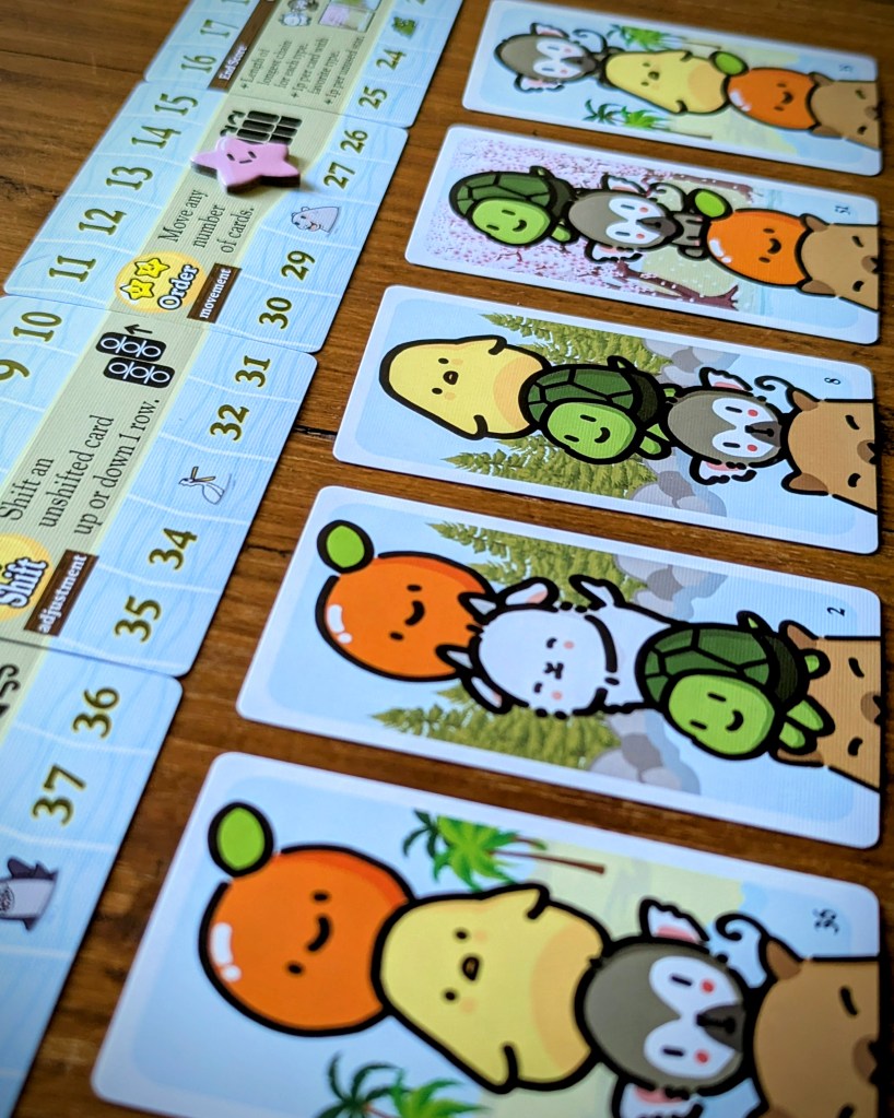 Capy Crush is easy to learn and play – thanks to a lovely rulesheet with illustrated examples. Each turn you’re analysing the best cards and star power combos to play to keep your chains growing. It’s puzzly but simple enough for most people to play and enjoy. There are some occasions where there’s opportunity to ‘hate draft’ river cards – like if there’s nothing you like, and/or you’re just after a card to put down as a capy. I did this a few times when I was more familiar with the game.