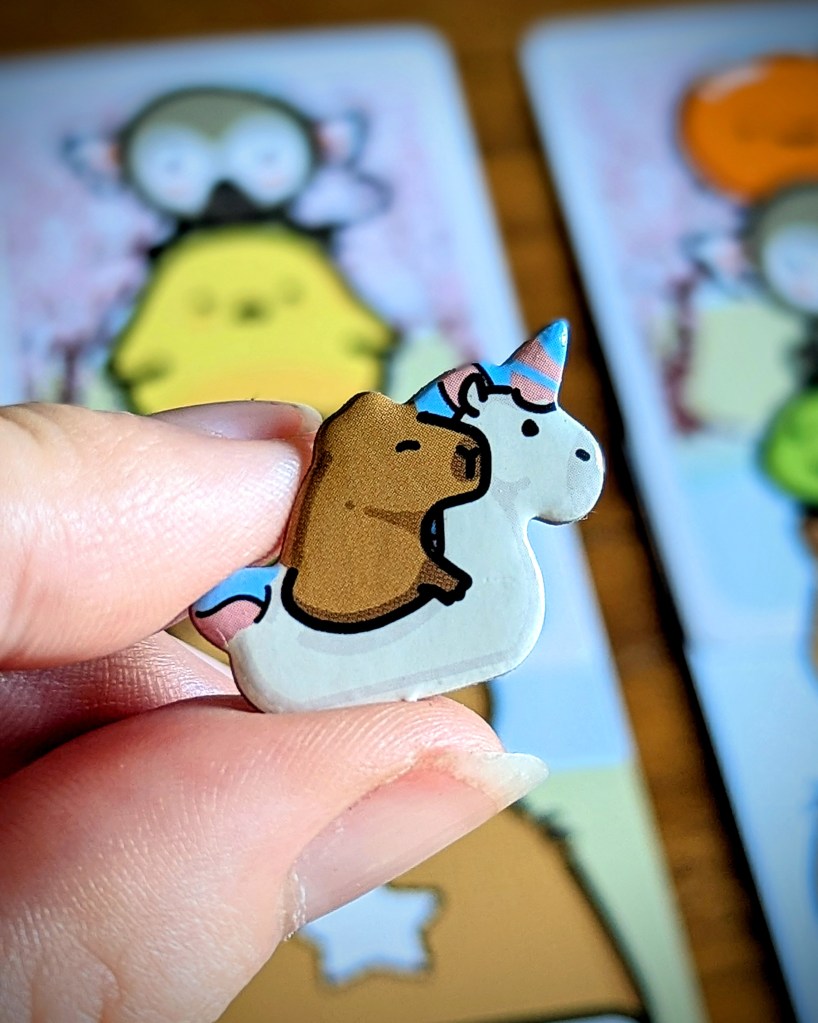 I didn’t think capys could get any more adorable, but Capybara Crush is here to prove me wrong! This artwork is super cute. And I love the little player tokens – capybaras on different floaties! I can’t decide if the flamingo or the unicorn is my favourite.