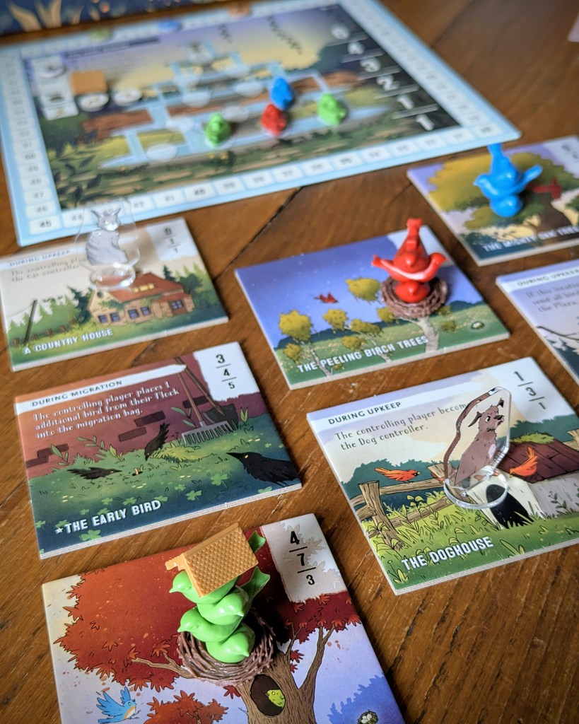 The highlight of the gameplay is the various ways you manipulate your own and other players’ flocks – either by placing recruited birds or using creatures. Even when you think you have a plan for the round, sometimes you have to switch it up to counter another player’s move! Combined with not fully knowing which birds you’ll get from the migration bag, there’s always some interesting decisions to make on the fly. We also like that the migration bag continues to roll over each round – meaning if there’s a round where no-one pulls your birds, that means there’ll be more of yours in the bag next round and more likely they’ll come out.