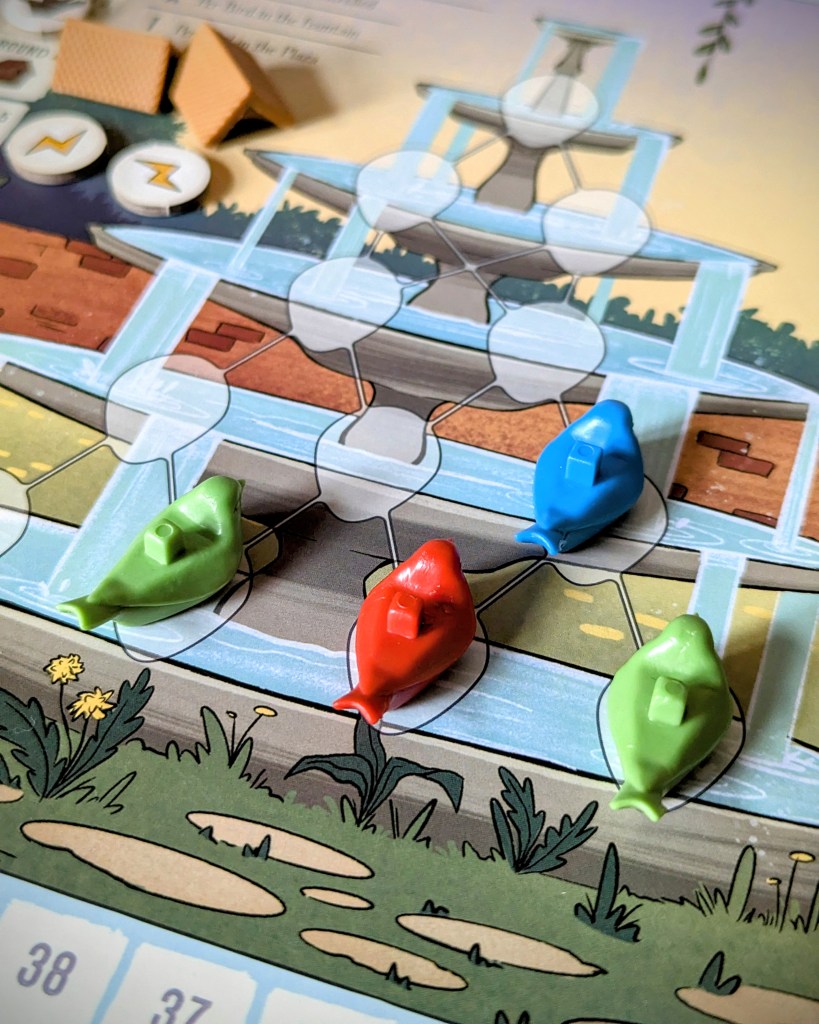 For a 2-player game, there is a ‘bird-brained’ dummy player that gets added to the migration bag, which is placed on locations and can be sent to the fountain. They don’t score points though!