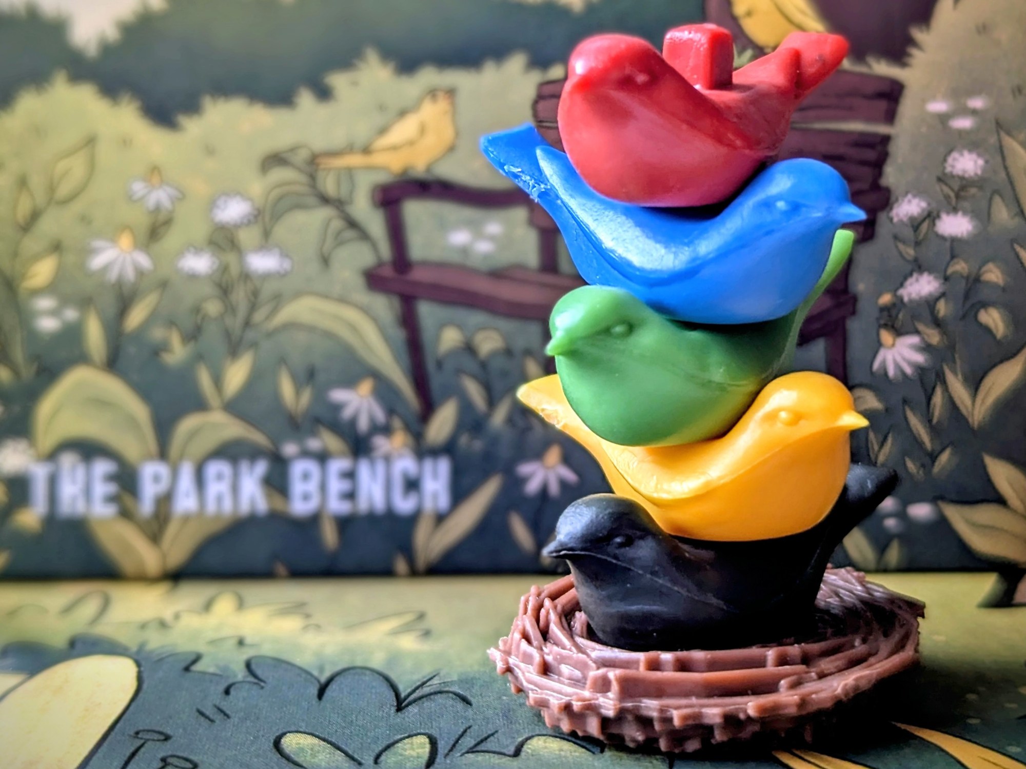 The game is played over 5 rounds. In the 4th round, each player gets a cute little birdhouse that they can use during any remaining turn to ‘complete’ a bird stack, which not only counts as a bird but also protects those birds from being moved around. In the 5th (final) round, players get a lightning token, which they can use to zippety-zap a bird of their choice, sending it to the fountain.