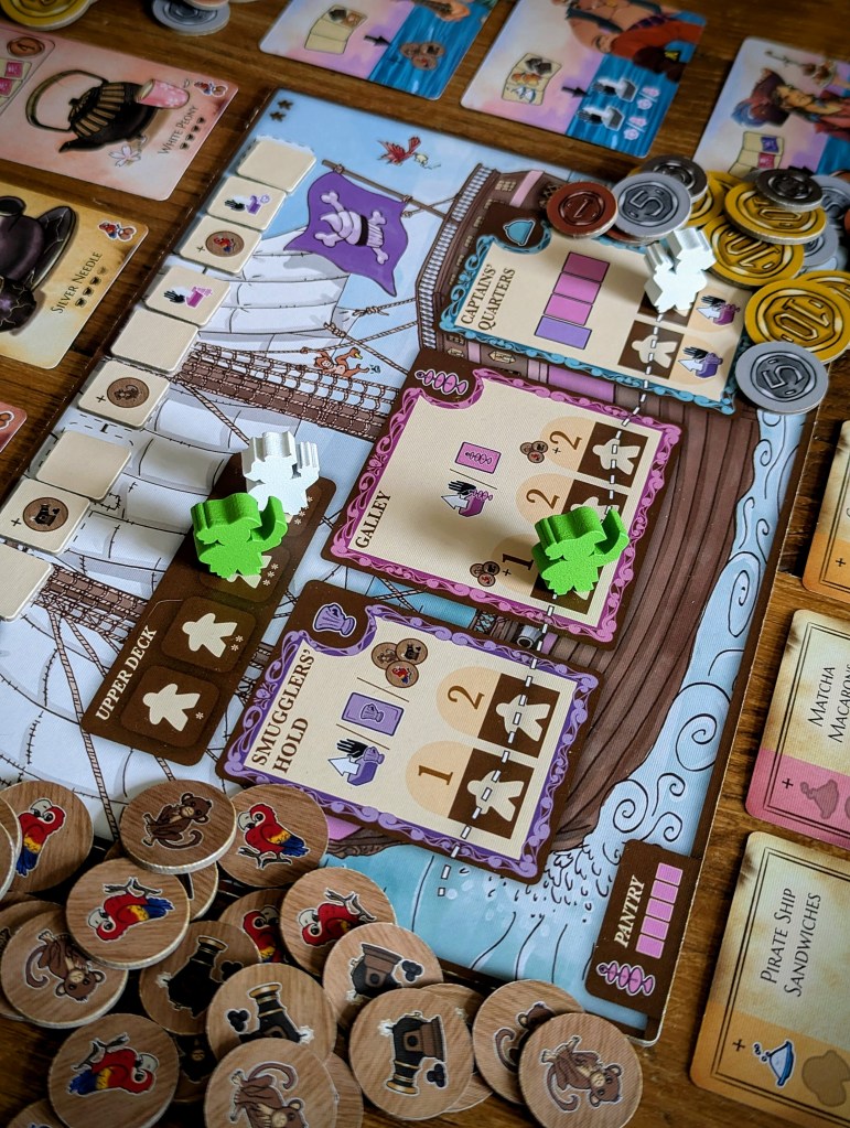 There is a solo mode, although we didn’t play it. Similar to the multiplayer mode, you’re collecting afternoon tea sets to serve to the Captain – serve at least 5 afternoon teas to win! But you have to match BOTH requirements on the tea cards, and rather than collecting the tea, you serve it straight from the tea track. Take too long, and the tea ‘cools down’, losing points and is eventually poured overboard. There’s also a couple of ‘scallywag’ pirates running around stealing dishes from the dish track.