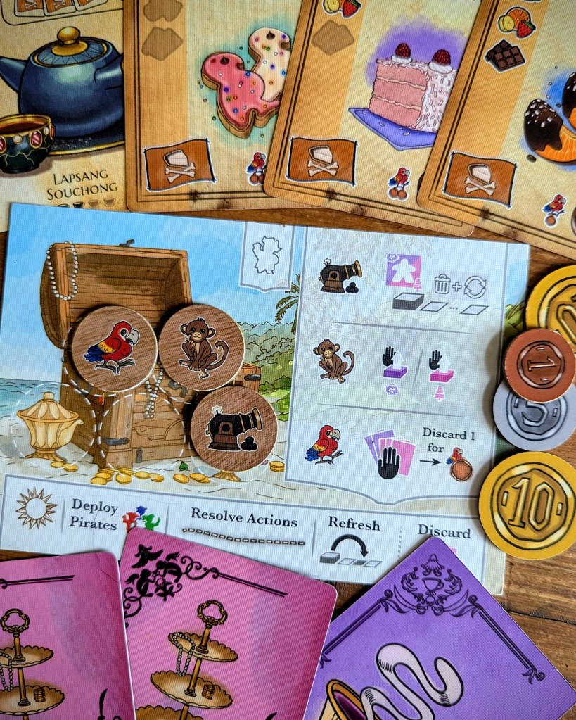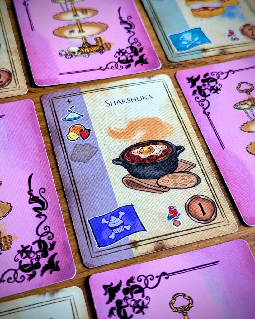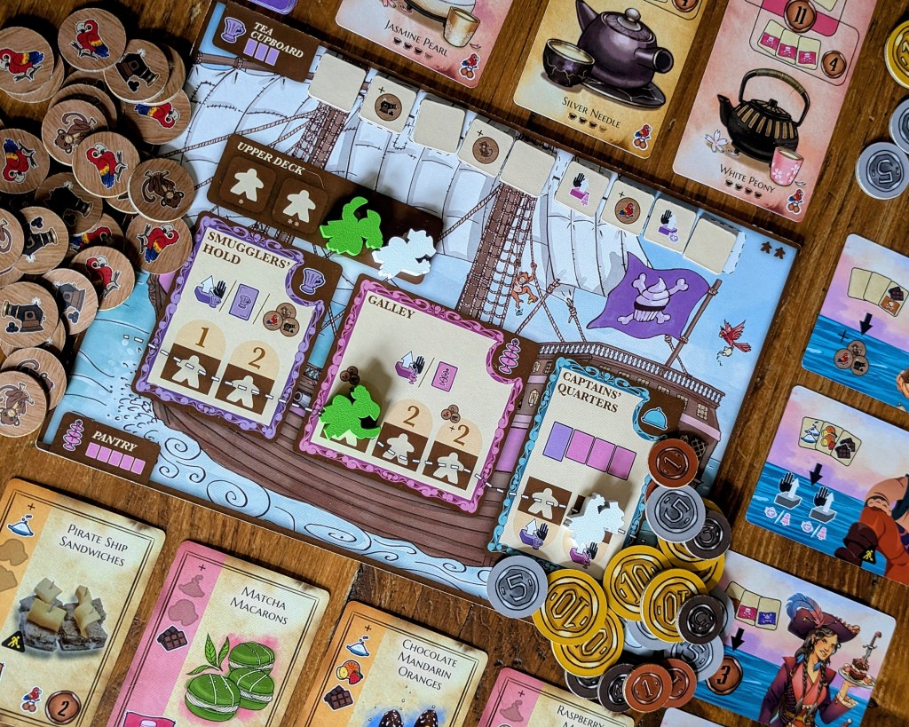 Players are pirates, collecting and perfectly pairing food dishes with teas, hoping to please the Captain’s taste buds and be rewarded with dubloons.