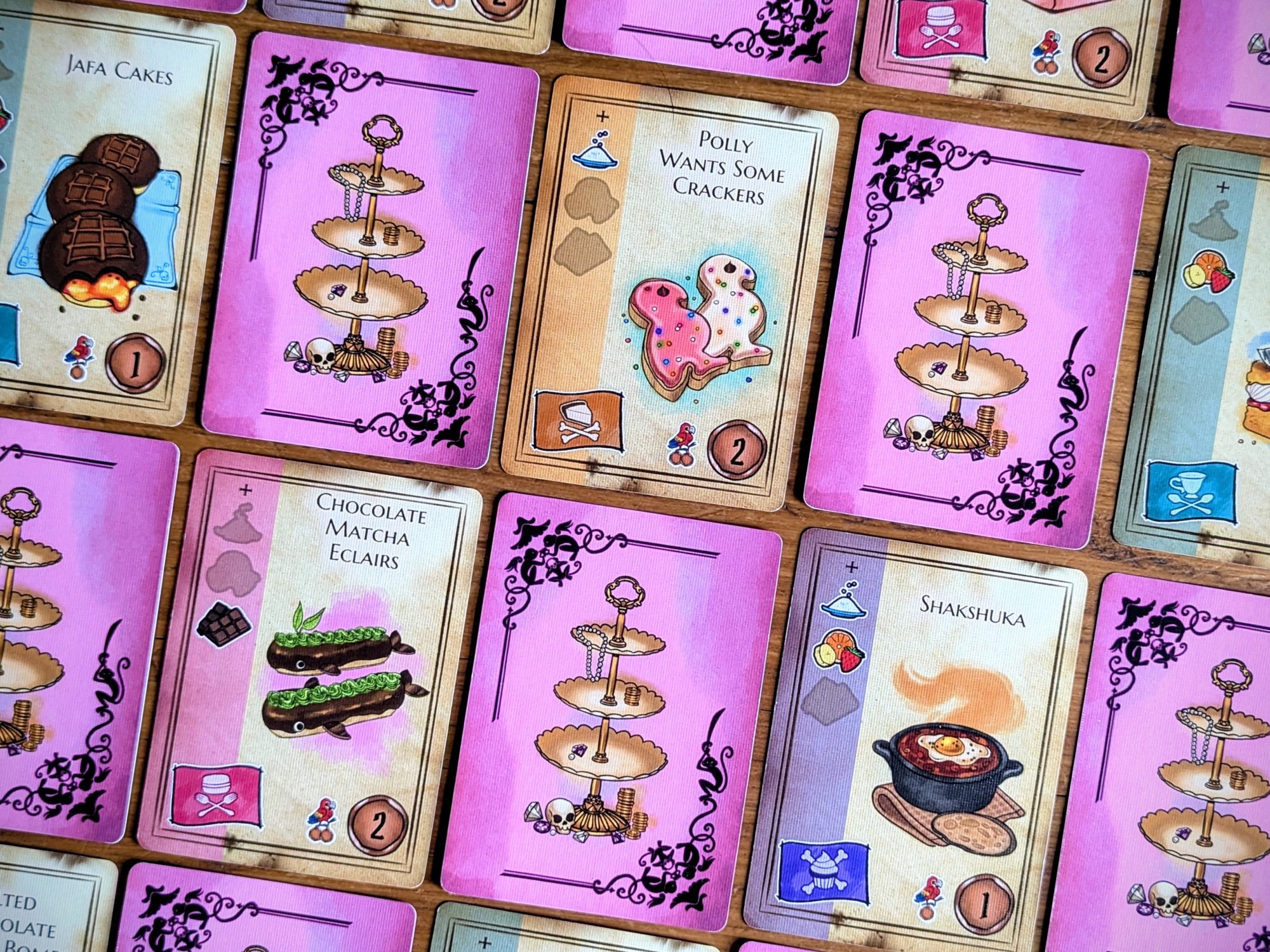 - Pirates of the High Teas is the most delicious looking game to have crossed our table in a while – so much so we decided to have afternoon tea while playing! (we skipped savouries and went straight for the cake!) There’s a brilliant variety of dishes, and we loved coming across the piratey puns. We would have loved to have seen some Welsh dishes – maybe there’s a call for a British mini expansion in the future.