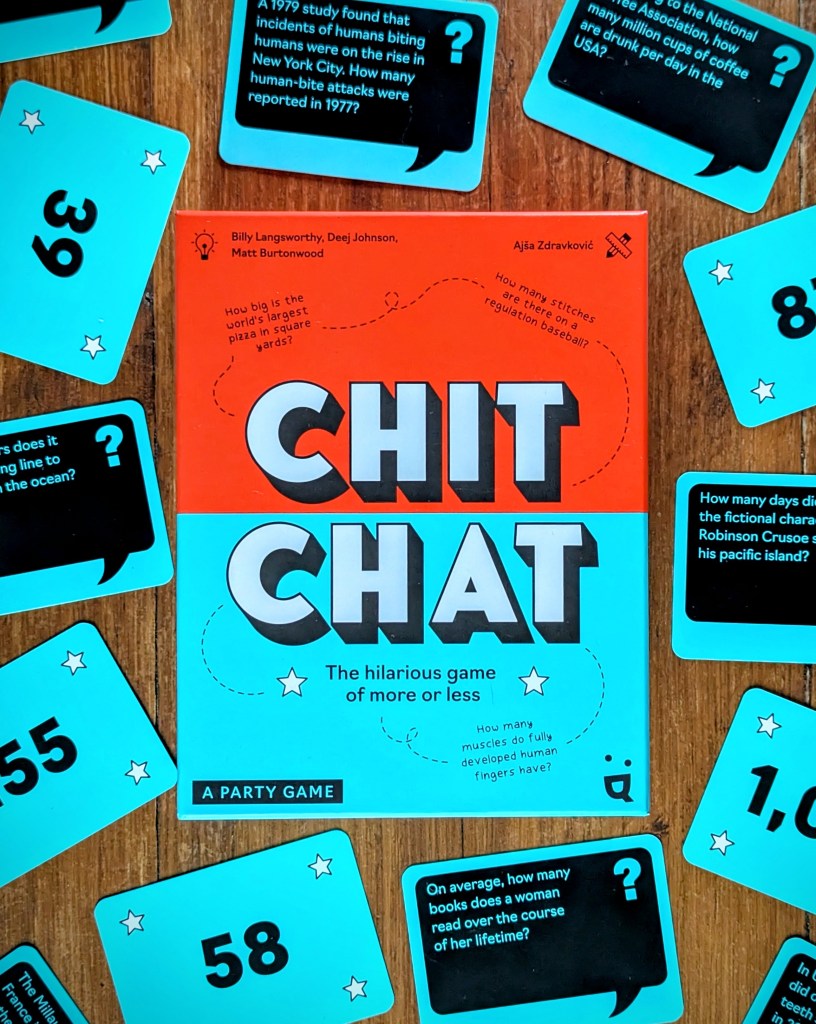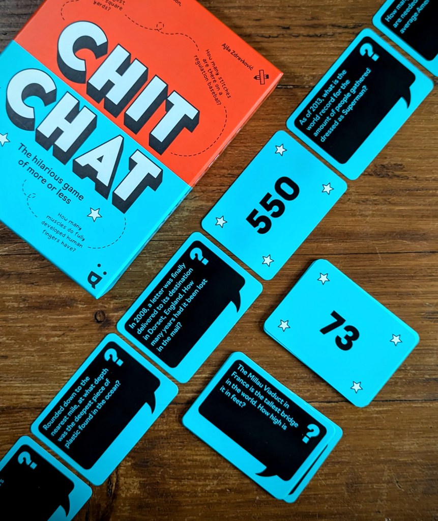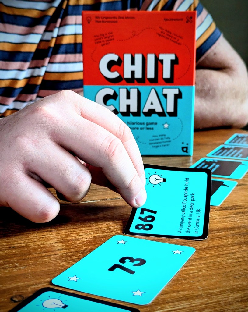 No, we haven’t resurrected Bruce Forsyth, although he would be right at home with the game we’re reviewing today. It isn’t ‘Play Your Cards Right’, but it is “the hilarious game of more or less”, Chit Chat. Let’s get right in.