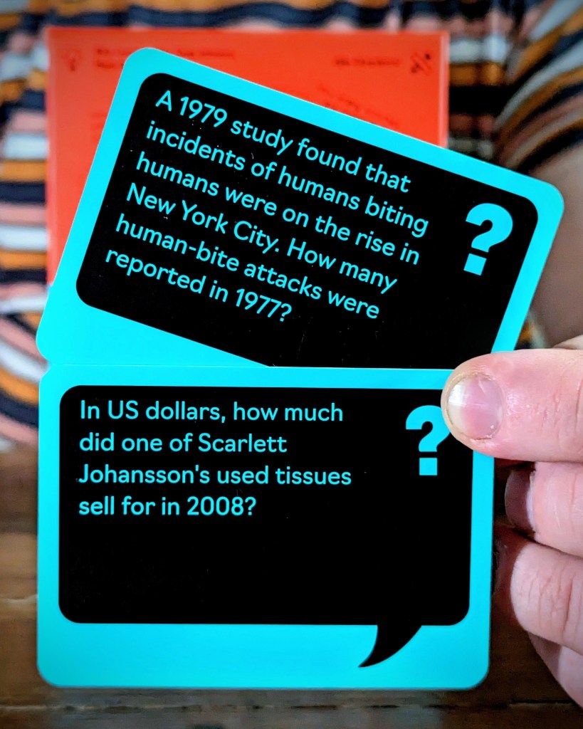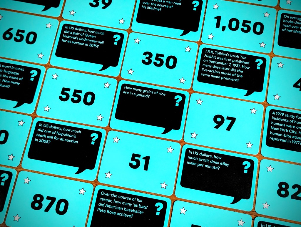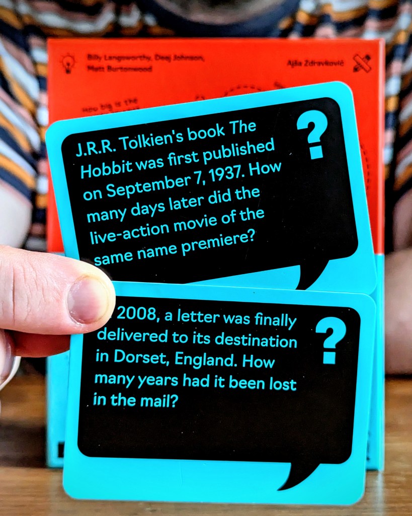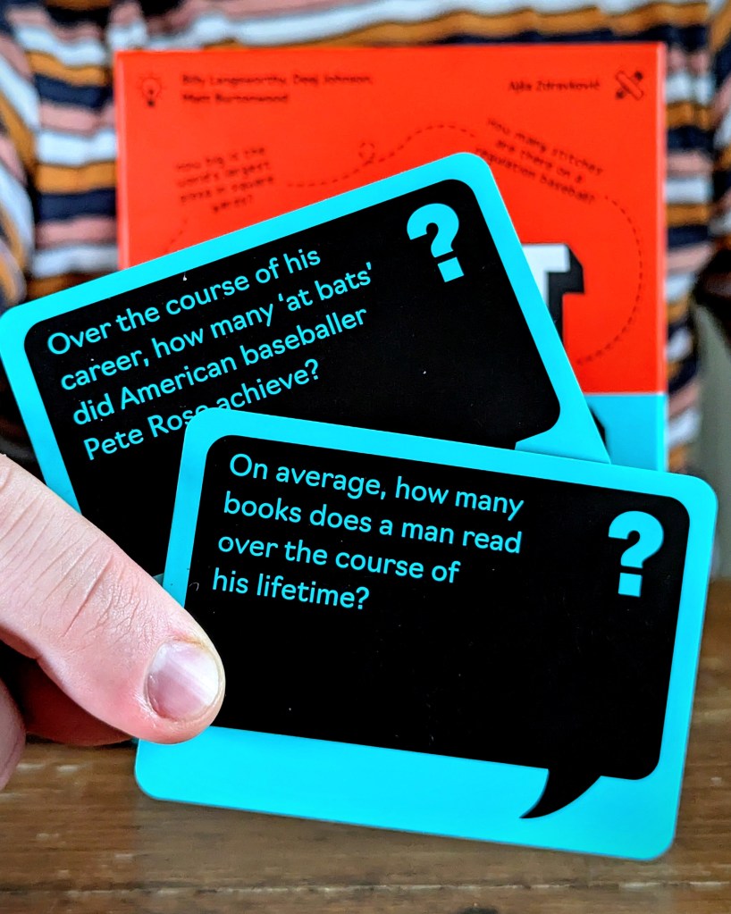 We did have a couple of niggles with some of the questions we came across. While there is a range of questions based around the world, there were a lot of American-based questions that required a much more specific knowledge of US geography/culture (like “How many stitches are there on a regulation baseball?”), so they felt much harder to guesstimate as non-Americans. There were also some questions where the answer was based on a US statistic, but the question didn’t indicate that at all, like “how many books does a man read over the course of his lifetime?” – your answer to this question would be very different if you’re thinking ‘in the world’ (as the question would imply). Using a slightly modified question set based on where the game is being sold and adding ‘In the US’ to the unclear questions would help. It also would have been nice to see a specific source listed on the answer side.