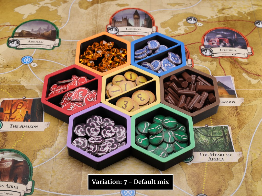 Token trays/bowls, dice trays and dice towers are also a fab option: Albion Craftworks have cool magnetic hexagon token trays in a range of colours, along with other upgrades!