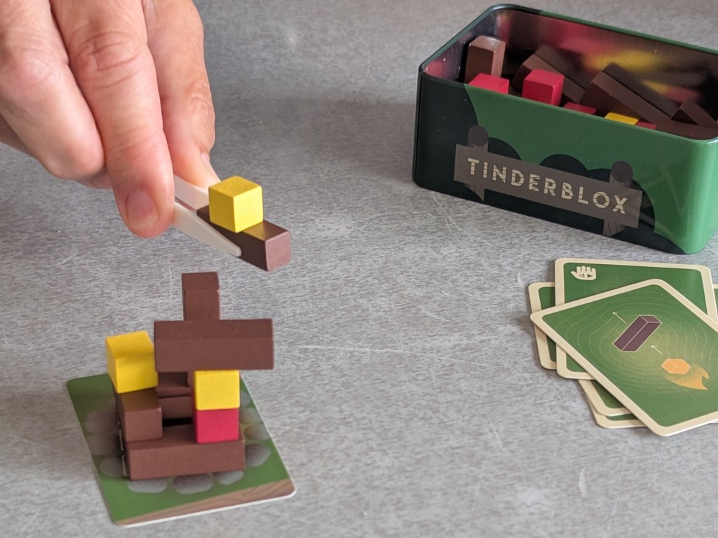 Tinderblox is a micro-dexterity game where players use tweezers to add fire cubes and logs to an ever-growing campfire tower. What you add is determined by the draw of a card – it can be a single item or a combo, and even sometimes forces you to use your non-dominant hand! The first player to topple the campfire is the loser.