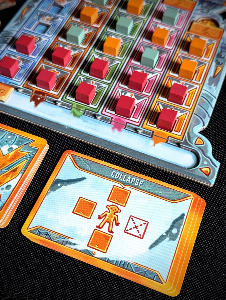 Once all set up, the rotating temple has a real wow factor! The artwork is ice cool, with awesome character designs and colour choices (extra kudos for using a pinky tone with a masculine character). The underlying map (where the idol and altar symbols are) stays in place, and so the rotating board combined with moving/rotating pathways creates an innovative spatial puzzle that switches up the game constantly. And it messes with my head! Spatial puzzling is one of Matt’s strengths, and I thought it was one of mine until I (more than once!) smugly rotated the temple only to realise I’d greatly miscalculated where I would end up… When you actually use the moving temple parts to your advantage (or to the disadvantage of others), it feels very satisfying.