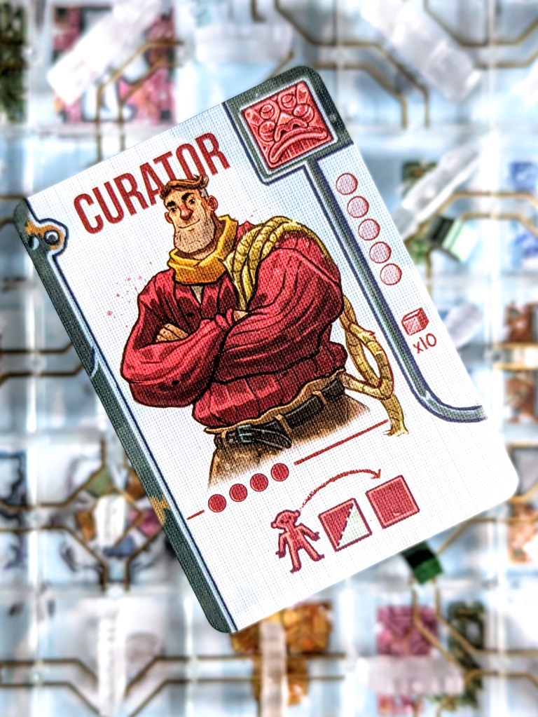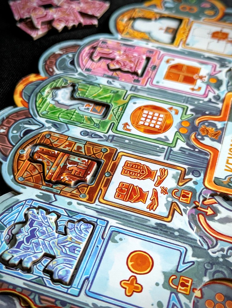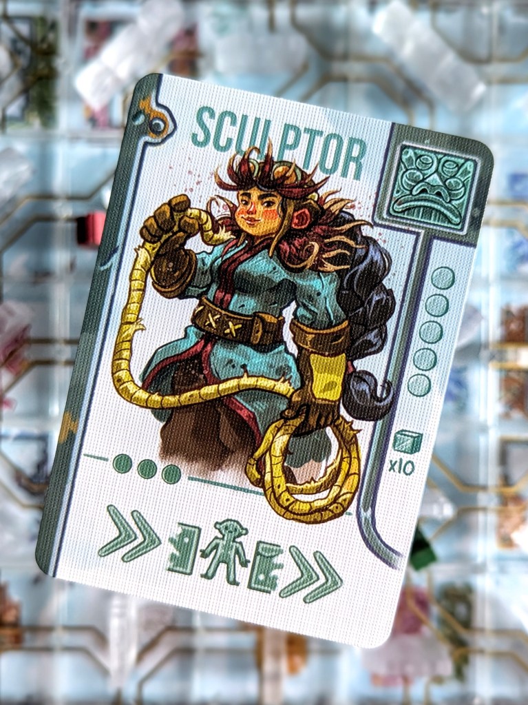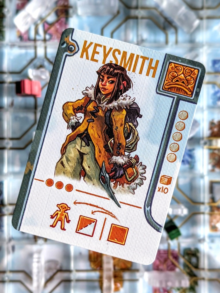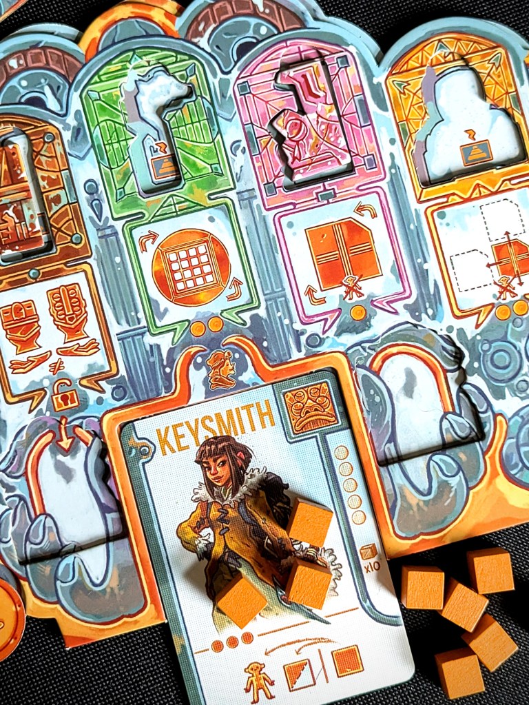 I loved puzzling out the best routes and optimal use of action points; because action points were limited you often have to make tight decisions, and you can rarely do everything you want to. The character abilities are powerful but cost a hefty 3 or even 4 action points, so using it takes up most of your turn. This stops someone from spamming a character’s power repeatedly, and we usually used them as either a hail mary action when we were really stuck, or as part of a wider satisfying combo of moves over multiple turns (assuming no one moves the temple to ruin it for you!). We also liked having different character abilities to choose from, although I found some more fun than others – my favourite character design and ability was the Keymaster (they could swap an adjacent tile with a discarded tile, very useful indeed!).