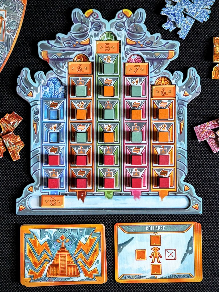 When you research an idol, you place a cube in your player colour on the research column for that respective idol. This always has a consequence (shown underneath the cube space), whether that’s something as nice as a few bonus victory points, or an event card that moves or removes parts of the temple.