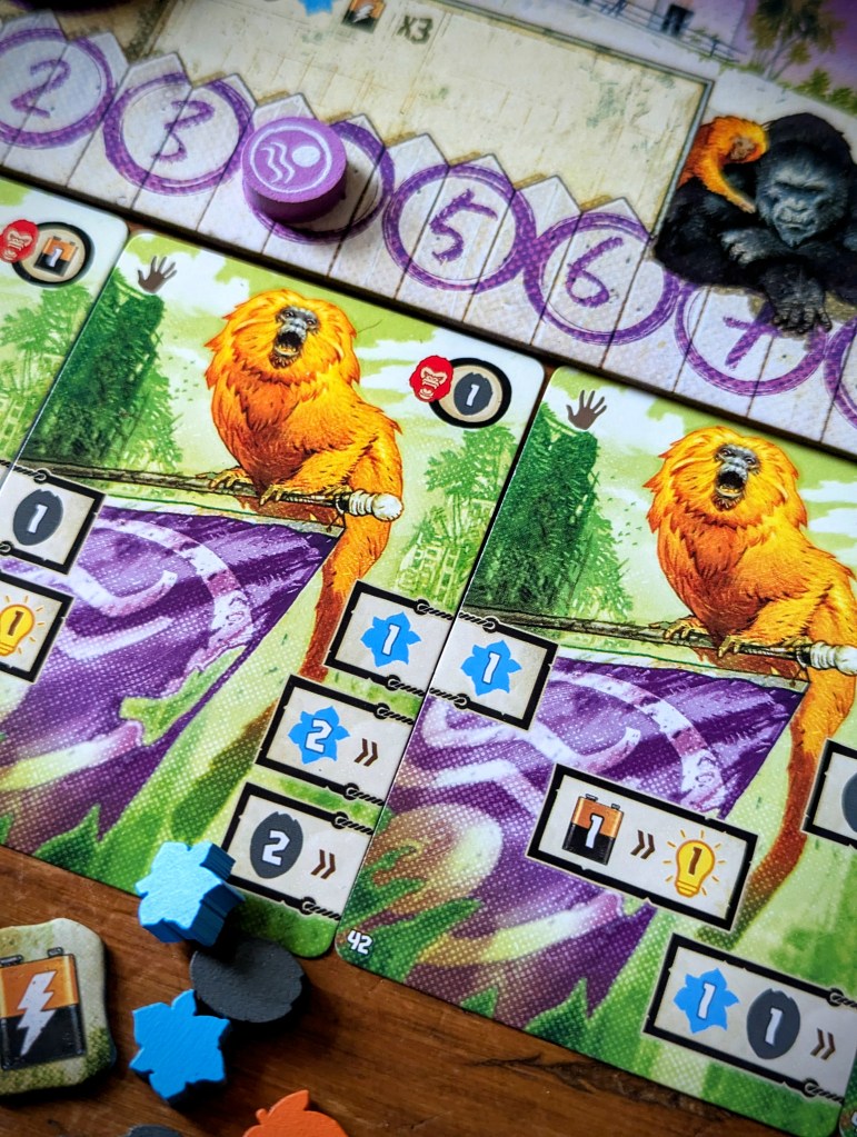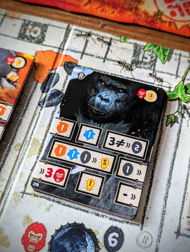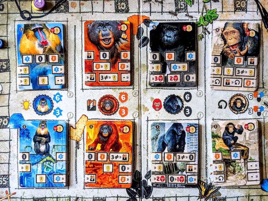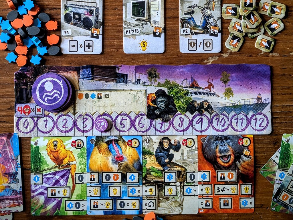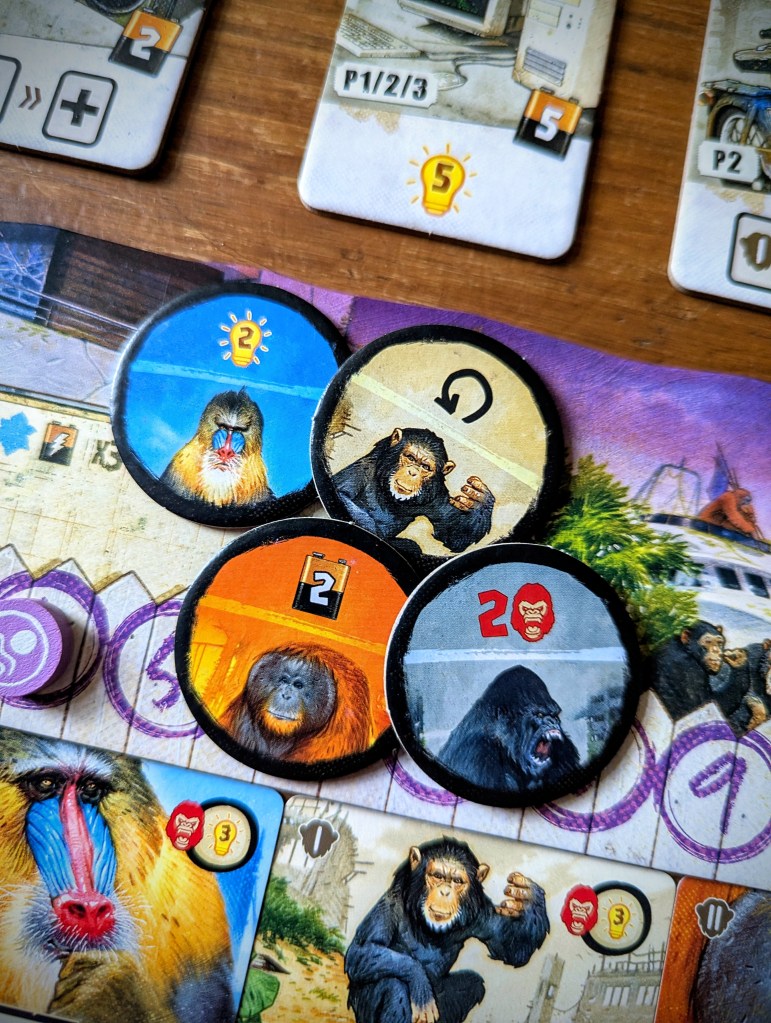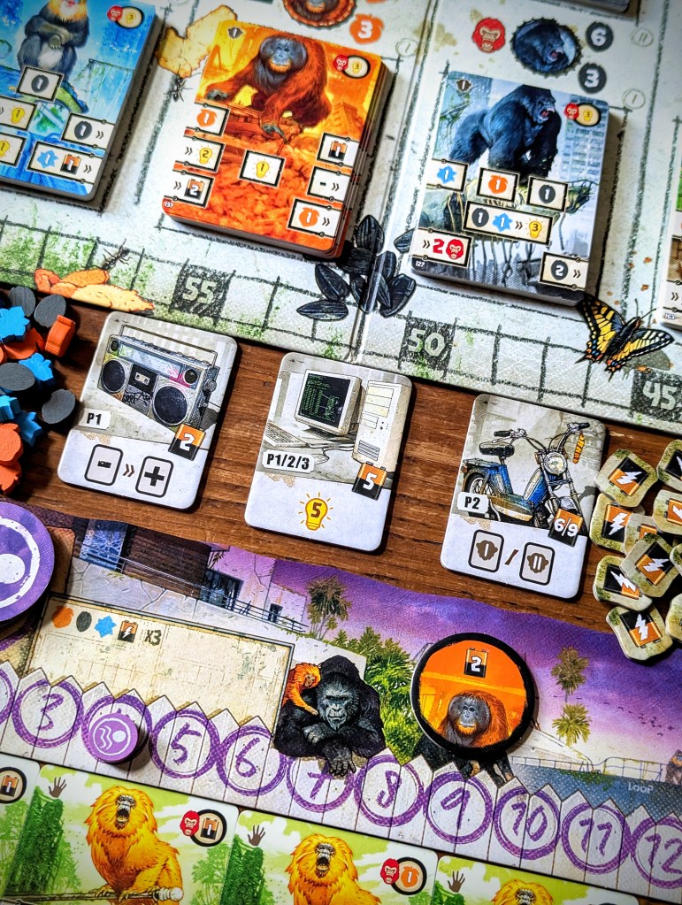 So as you might have gathered, this game has very little player interaction. You can activate other players’ token bonuses on a pay-to-use basis (can be useful but in my experience this wasn’t used a lot). At the full playcount there is a potential risk of some of the ape decks to run out, which can impact your strategy. But otherwise this is a multiplayer solitaire affair, which is enjoyed by some but I know it isn’t for everyone. The simultaneous play helps because it keeps the downtime to a minimum and means the game plays smoothly and quickly, regardless of player count.