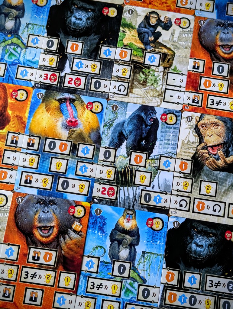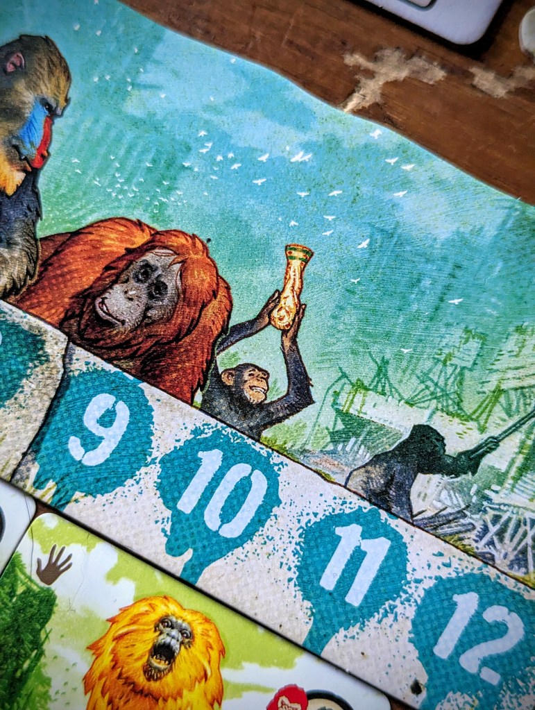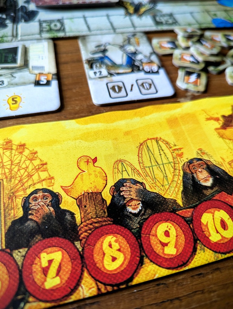 Finally, I want to acknowledge that of course Dutrait’s art is, as always, incredible. Each player board is a different colour and shows apes chilling out at different abandoned locations, from a football stadium to a yacht club. The colours in the red (supermarket) and yellow (theme park) boards make me feel a little uneasy, but I love the 3 chimpanzees at the theme park.