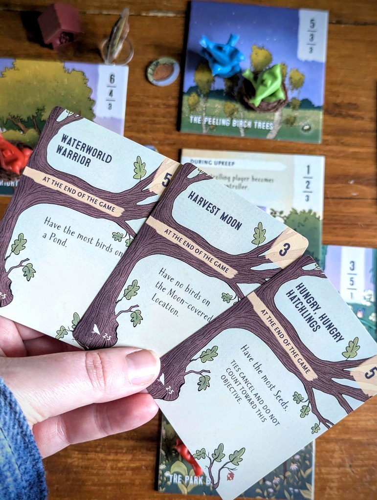 Perch: Birds of Play includes 3 new mix-and-match mini-expansions: Seeds the day, Points in the sky and Pondemonium. You can add one, add two, add them all – it’s really up to you! The box also includes 20 new hidden objective cards that are mostly specific to the new expansions.