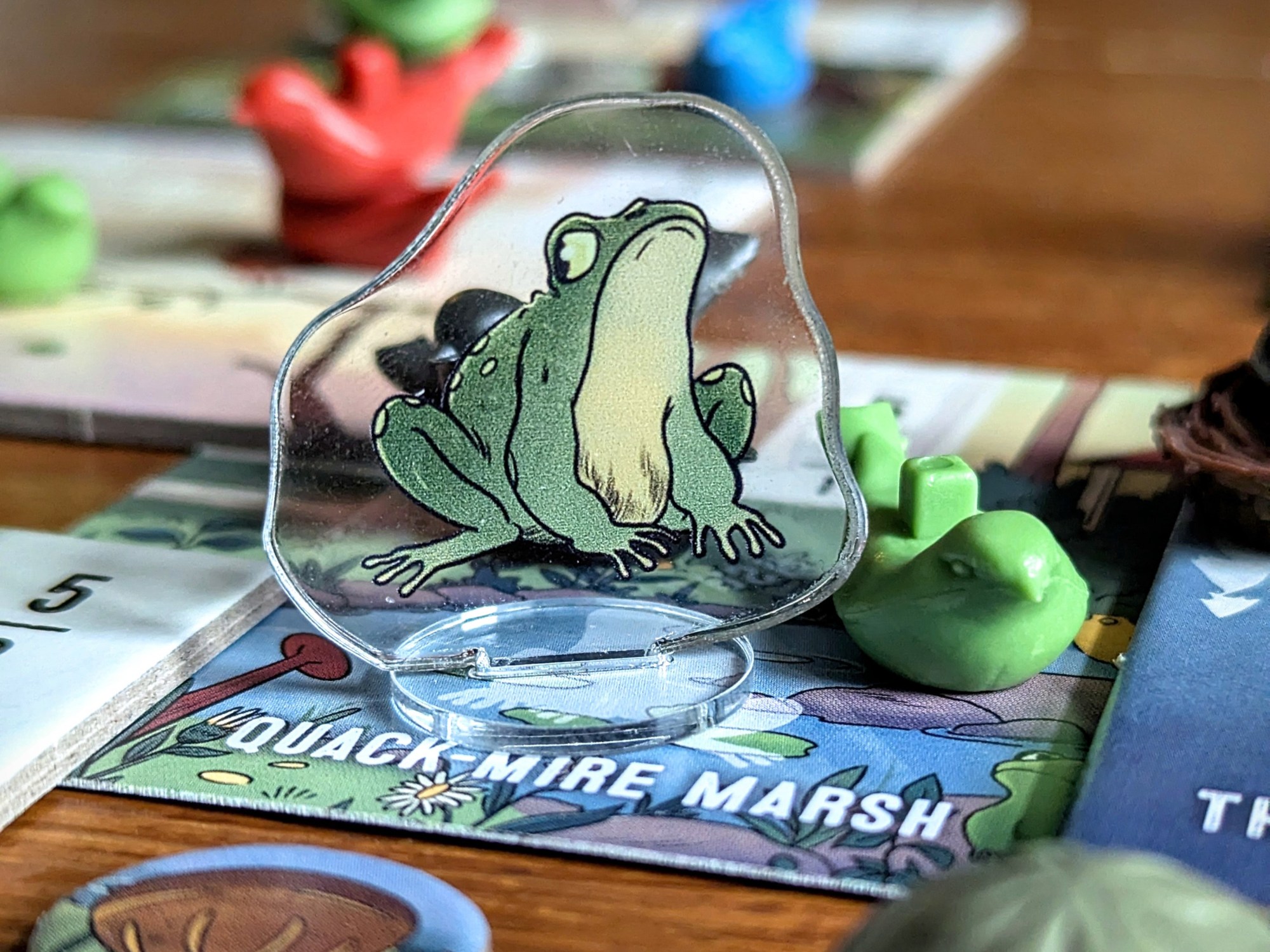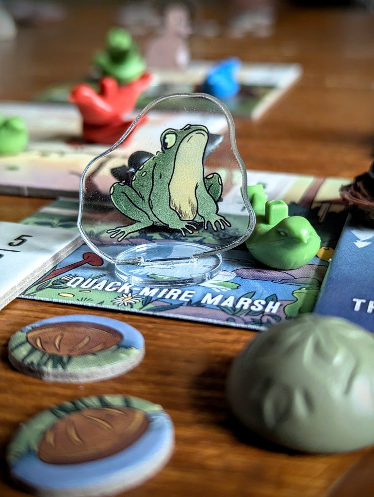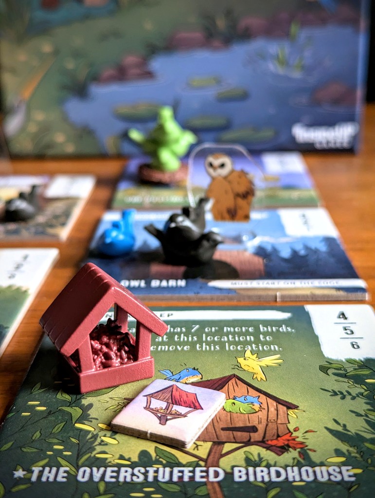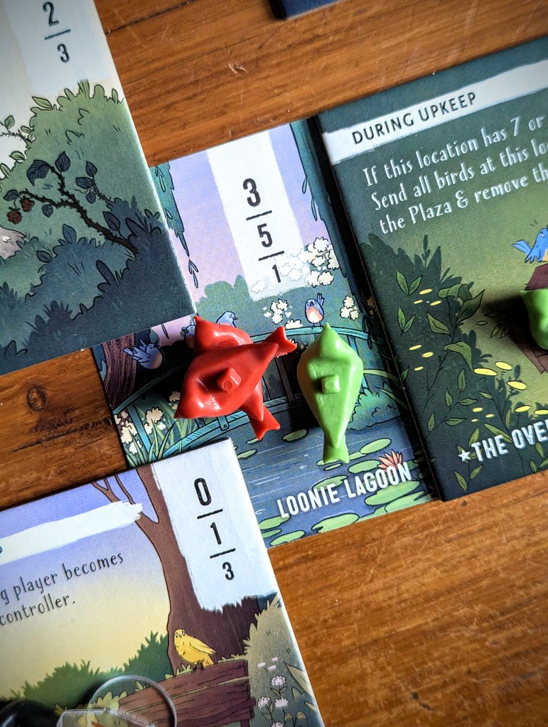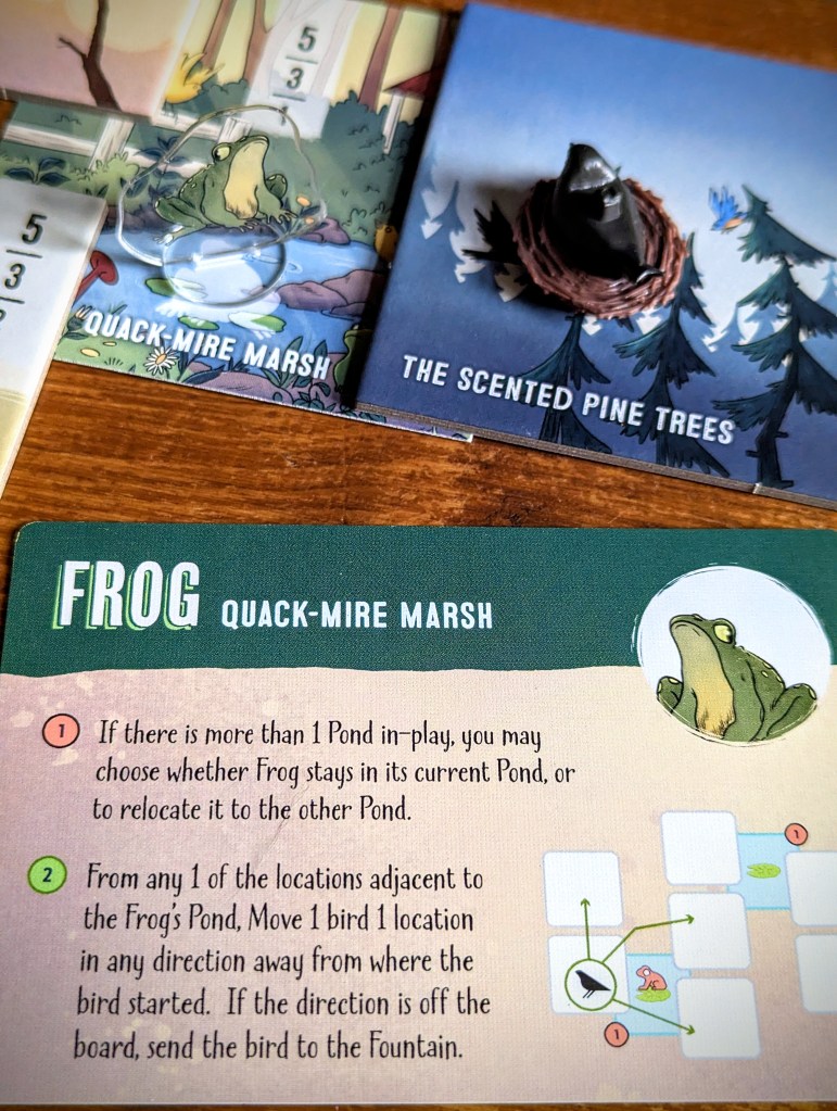 There are 4 ponds to choose from, and 2 of them come with new critters – control the pond, control the critter! The frog can bump a bird from the pond-adjacent locations to 1 space away (including off to the fountain), while the perch can send a pond-based bird to any other location in play.