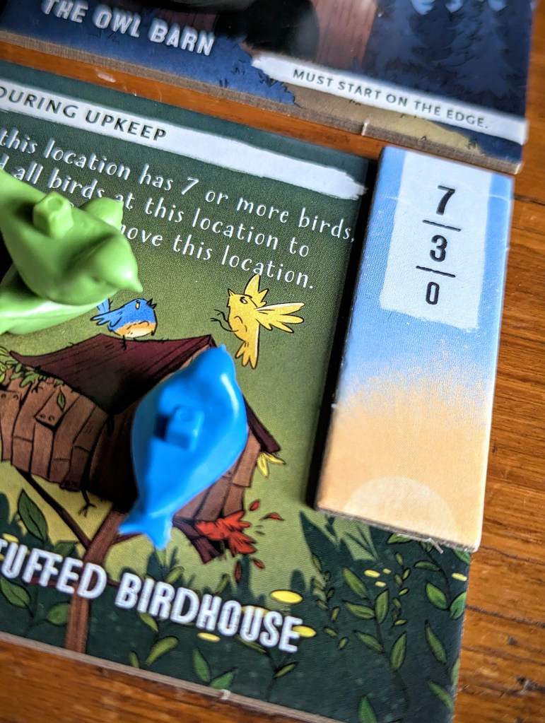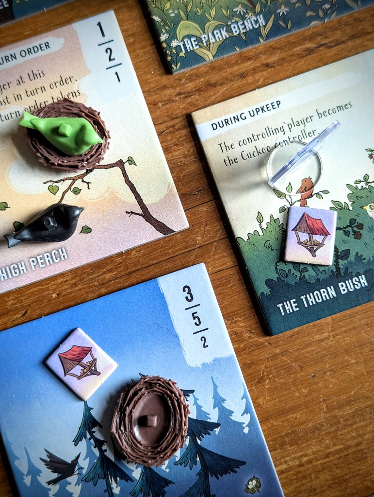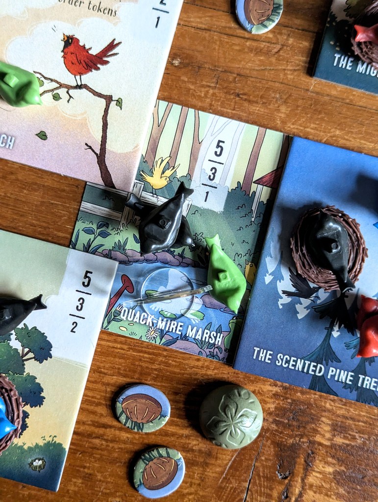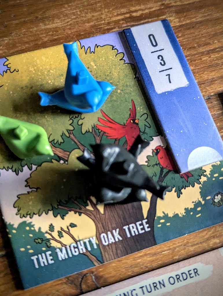 It’s said that the early bird scoffs the seeds (or something like that…), and that’s exactly what Seeds the day is all about. During game set-up, each location gets a bird feeder token. Whoever owns the first bird that is placed at a location (regardless of who puts it there) claims the Bird Feeder and 3 delicious points. In 2-player games, the ‘bird brained’ dummy player can still claim Bird Feeders, but not the points.