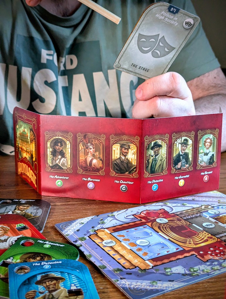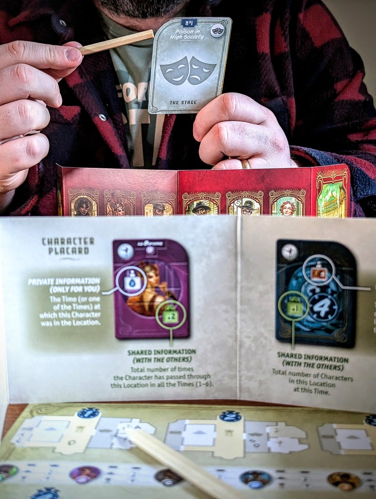 Once you’ve chosen your scenario and investigation, set up the game as outlined in the investigation booklet. This tells you what questions you need to solve, where the characters are at TIME 1, and any investigation-specific rules. In Poison in High Society for example, the detective has been found dead in his bed, poisoned at the Opera the night before! Your aim is to identify the assassin, who was the only character who had alone time with the detective, and confirm the location and time the poisoning took place.