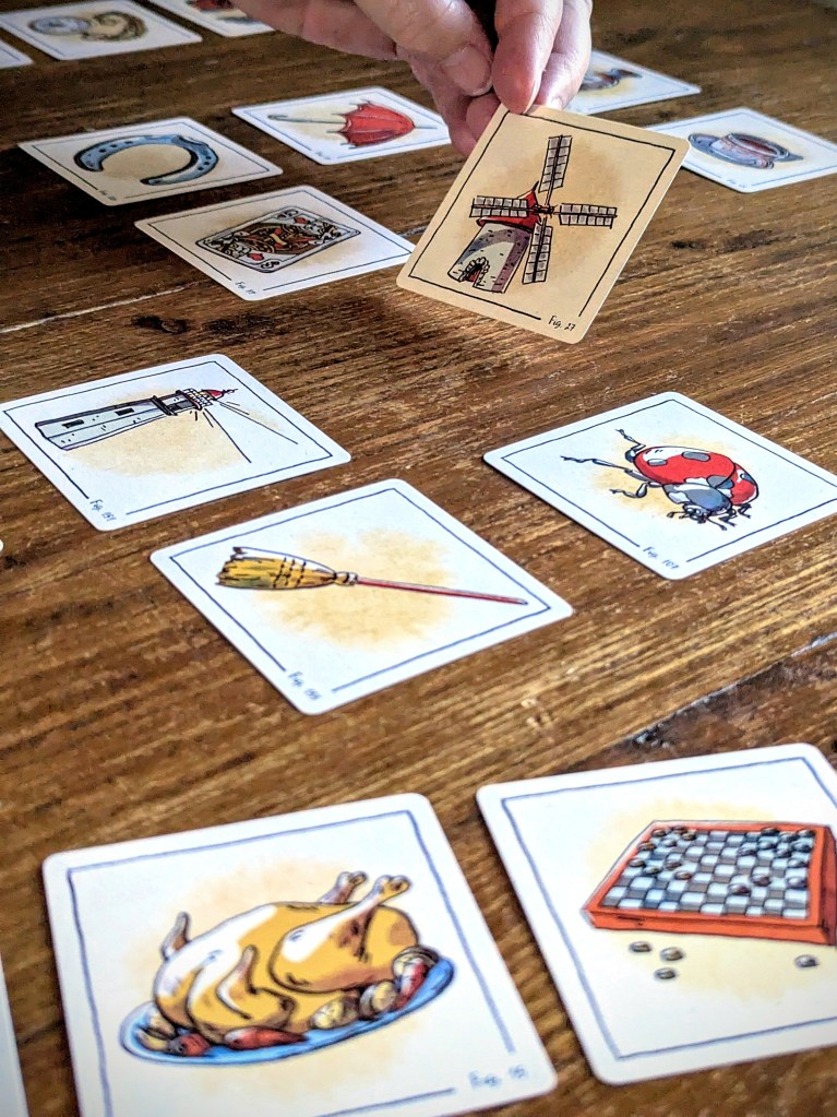 What can also feel impossible is figuring out what on earth your partner is trying to tell you through their card selections. Obviously at the beginning there’s more choice and you can pick cards with better associations to your item (assuming there are any, that is!), but as the game progresses it gets hard and you have to get more creative. This is why you keep the items you selected in order, because your partner can see which ones you picked when (and therefore which are more likely to be relevant/useful). Often you might think you’ve cracked the case, but then they pick something so random it blows your theory out the water. But it’s oh so satisfying when you do manage to make it to the end with only your items left in play!