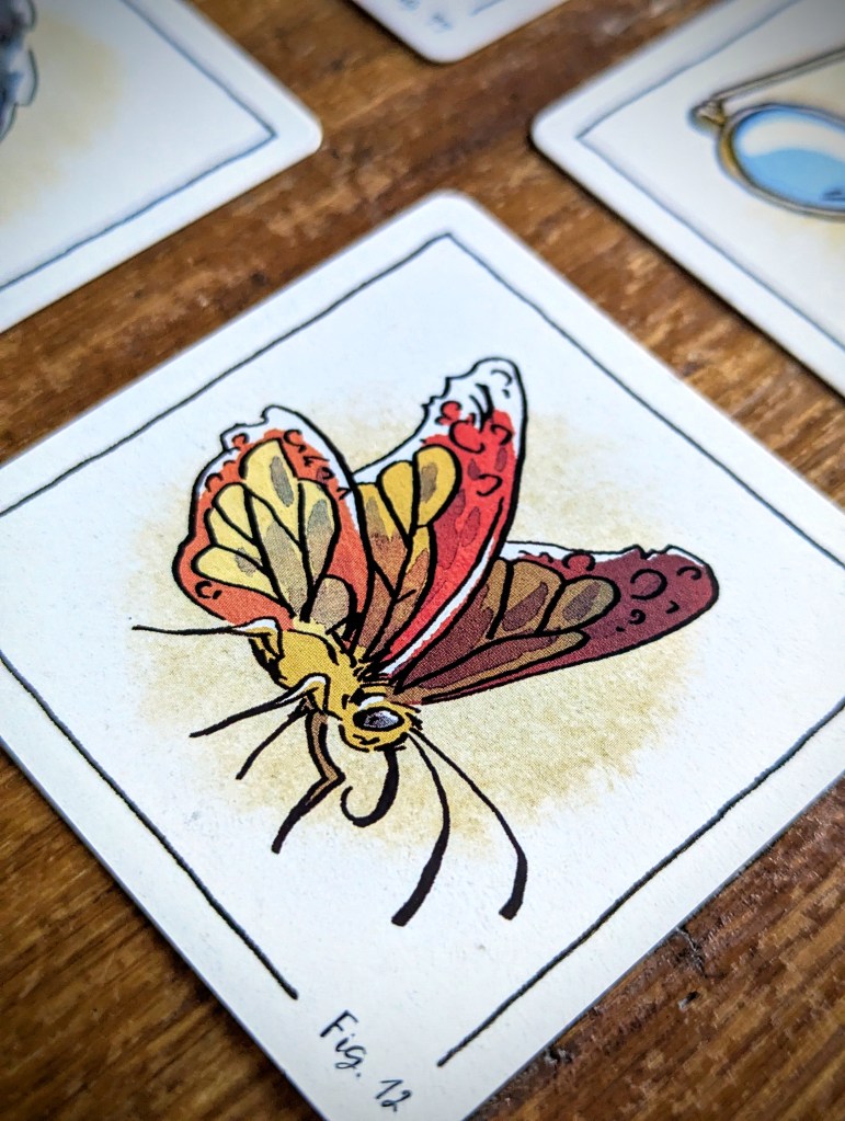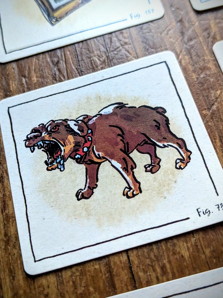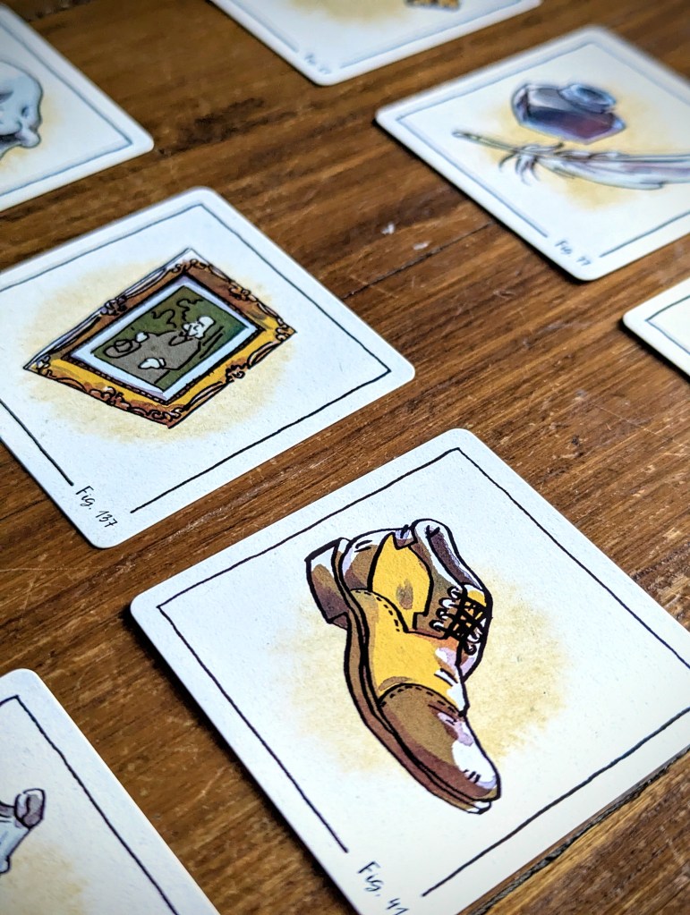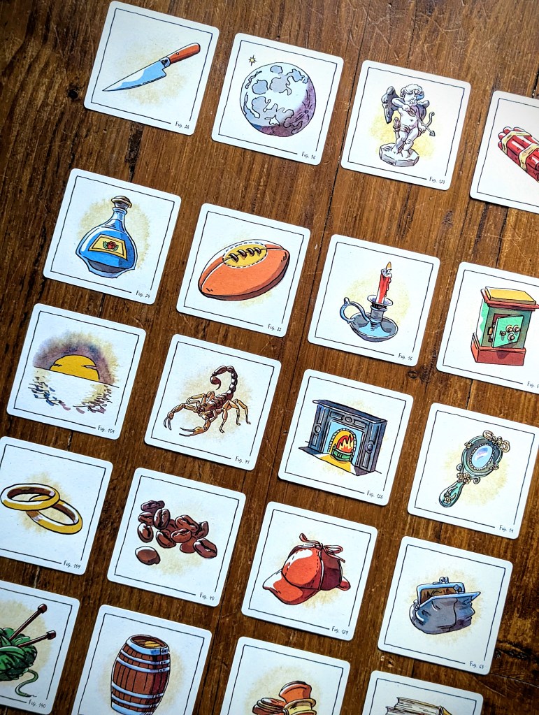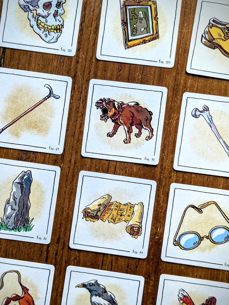 The set-up is superquick – unless you want to play a game with all the cards of a specific case (helpfully listed in the rules thanks to Mrs Hudson, but an absolute faff to find among the 84 double sided item cards). I can imagine for a Sherlock superfan it would be quite fun to see all the different items from different cases that have been included – for me, I just enjoyed the artwork and appreciated the weird and random.