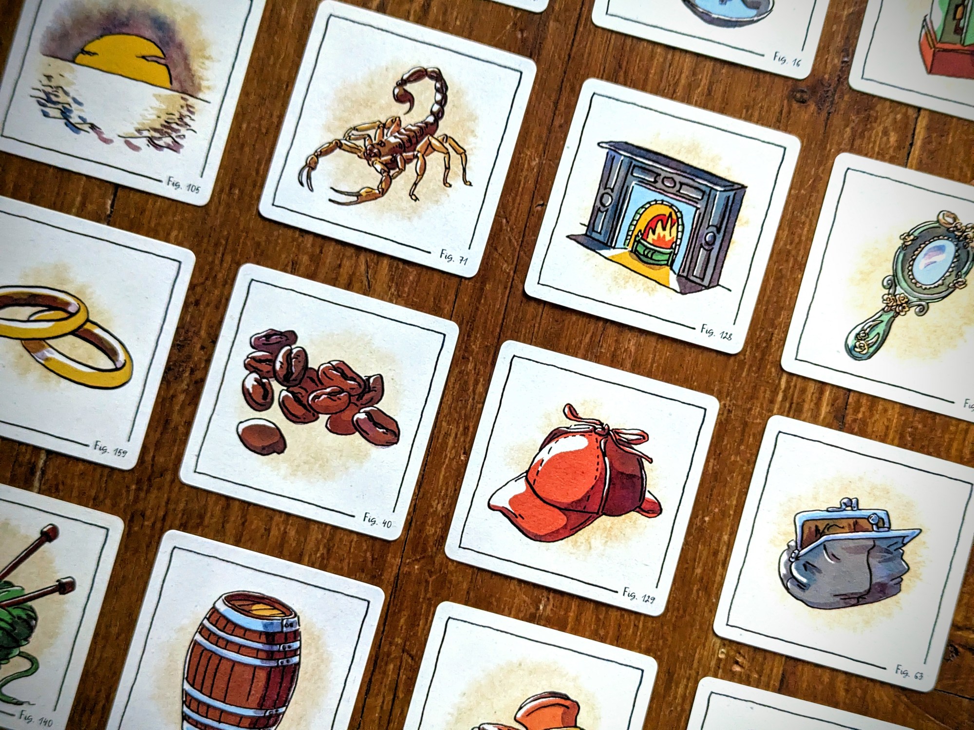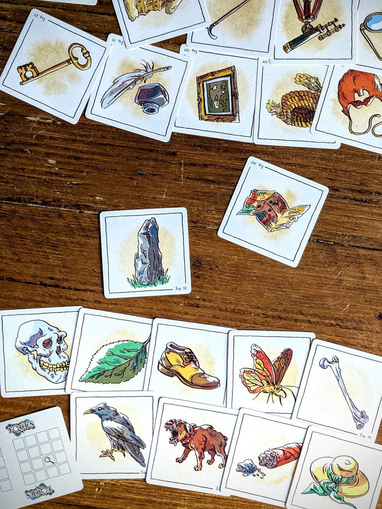 A game of Focus is played through a 4×4 grid of random items taken from famous Sherlock Holmes cases. Each player is secretly assigned one of these items, and to win both players must successfully guess their partner’s item.