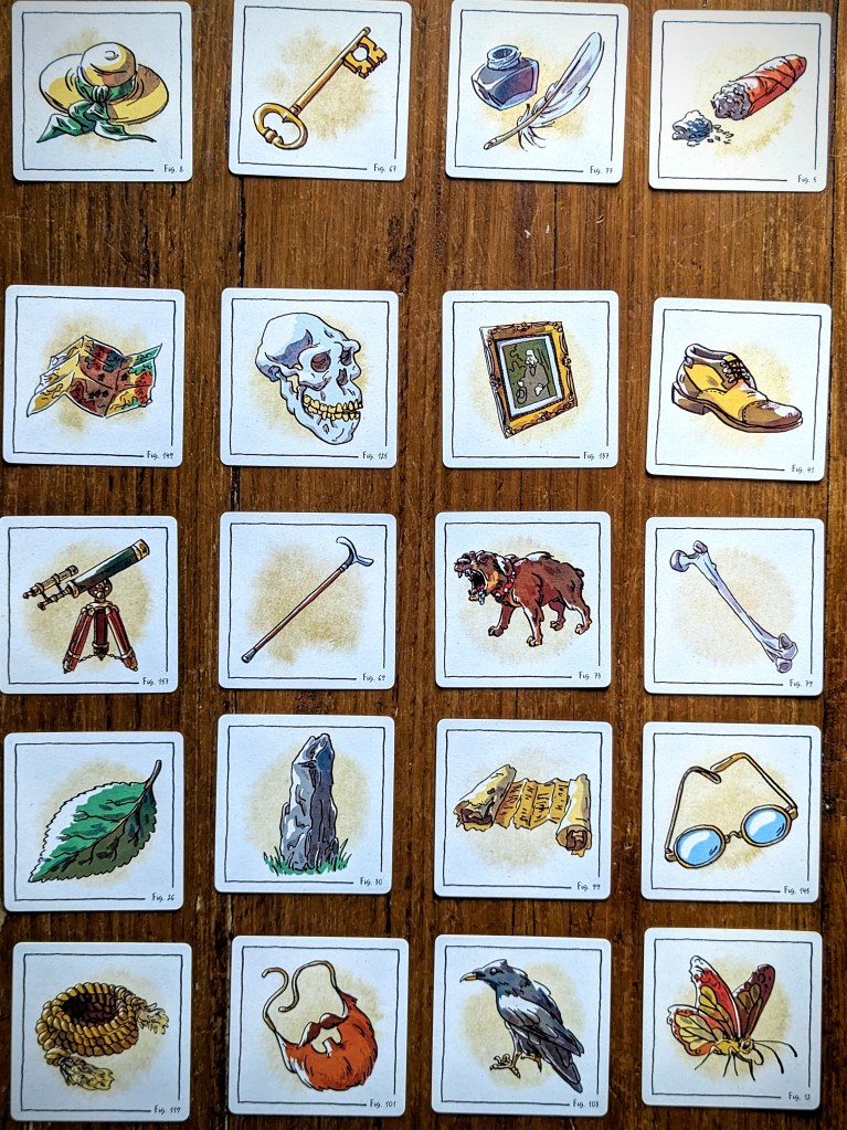 The gameplay I’ve just described is called Watson mode, and the rulebook includes a few variations with increasing difficulty. In Sherlock mode, for example, players can end the game early if they think they can guess each other’s items. In Mycroft mode, each player has TWO secret items but still only collects one row of clues – they cannot say which clues are for which item!