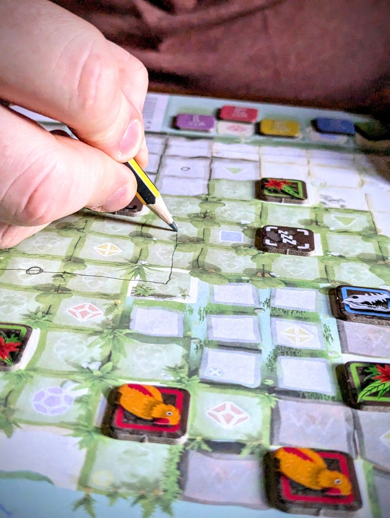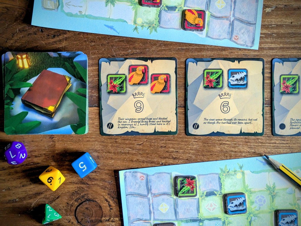 Isla is a roll and write adventure where players move around an island to collect flora, fauna and fossils, exchanging them to claim research cards worth sweet sweet points. Each player has their own copy of the map to draw their movements.