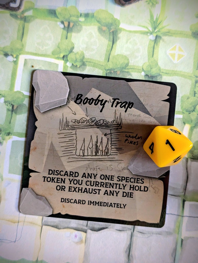 Anyone who chose to Explore this turn chooses a dice result and moves that many grid spaces in on their Island map, collecting any tiles they walk over. They can follow any orthogonal route they want, but can only visit each space once. Whichever dice that player chose now gets covered on their island sheet – it is now exhausted and can’t be selected again unless it gets refreshed.