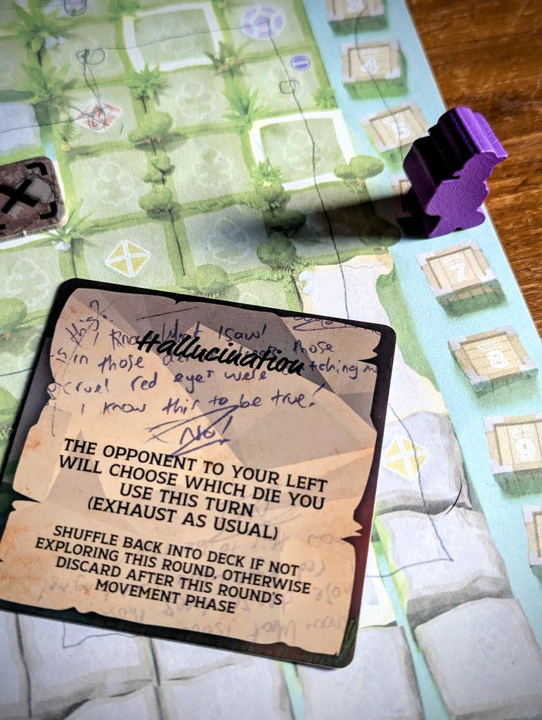 This is where the Rest action comes in, which lets players cross off the ‘Rest’ box on their sheet and refresh their smallest exhausted die. This is only available once per game, plus a bonus extra time if the player manages to pick the Rest tile when exploring. BUT…there are also dice icons scattered across the island, and if they move onto a space with a dice icon they can immediately refresh that specific dice.