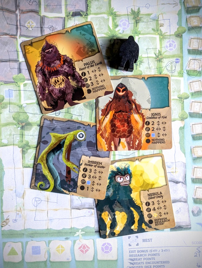 The solo mode introduces the Keepers: mysterious creatures that live on the island and are NOT happy to see you. For a solo game, you select a Keeper based on the difficulty you want to play, and put the Keeper meeple on the map.