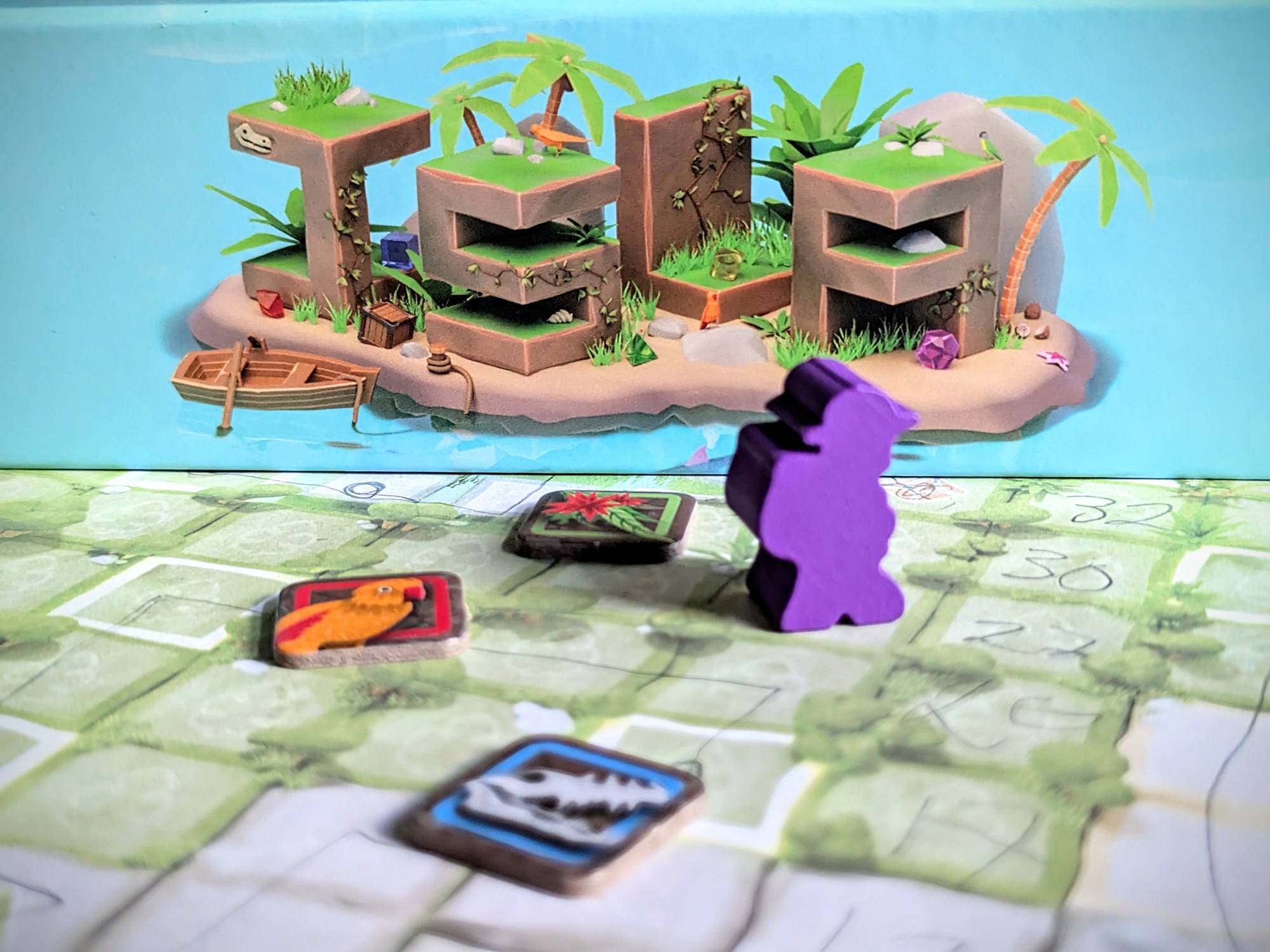 The solo mode introduces the Keepers: mysterious creatures that live on the island and are NOT happy to see you. For a solo game, you select a Keeper based on the difficulty you want to play, and put the Keeper meeple on the map.